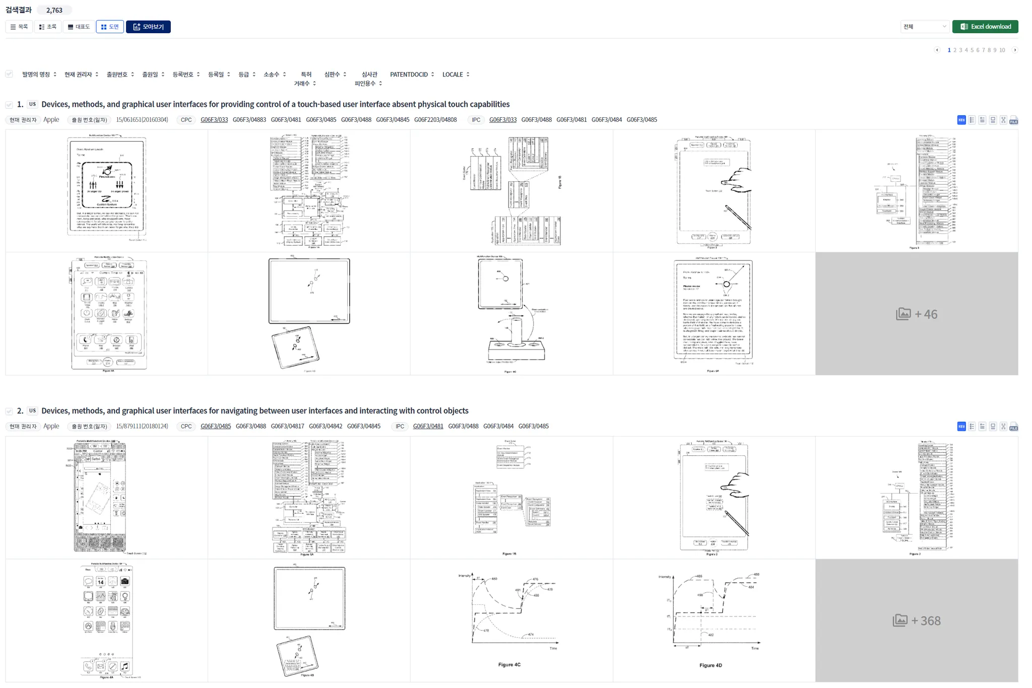 “도면 중심형” 모드는 “대표도 중심형” 모드에서와는 달리, 각 특허의 모든 도면이 나타납니다. 통상적으로 특허 1개당 도면연 10~30개 정도이므로, 특허 검색 결과가 많으면, 너무 많은 도면이 나타나는 문제가 있습니다.
