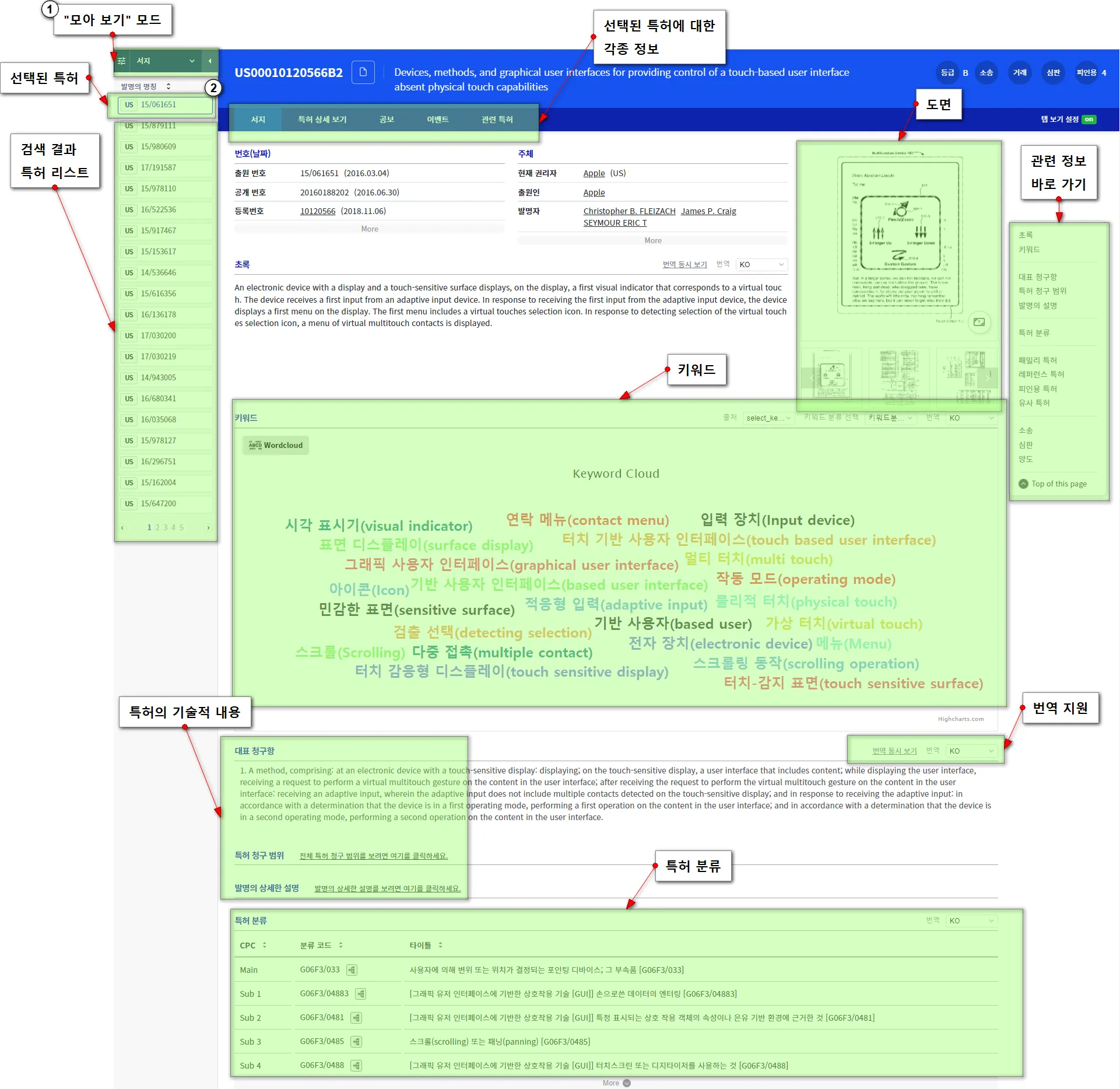 “모아 보기” 모드는 특허를 1개씩 넘기면서, 특허에 대한 종합적인 내용이 나와 있는 “서지 페이지”를 중심으로, 특허의 내용까지 확인하면서, 자신이 원하는 특허를 검색하는데 사용되는 효과적인 모드입니다. “모아 보기” 모드는 특허 목록의 전환 없이, 각 특허의 i) 서지 페이지, ii) 특허 상세 내용, iii) 공보, iv) 이벤트, v) 관련 특허를 한꺼번에 열람할 수 있는 모드입니다. 특히, “서지 페이지”에는 특허의 기술적 내용을 빠르게 파악할 수 있는 i) 초록, ii) 대표 도면을 포함한 도면 리스트, iii) 키워드 클라우드, iv) 특허 분류, v) 대표 청구항 등을 한꺼번에 나타나 더욱 더 검색의 효율성이 높습니다.