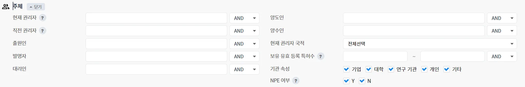 특별 가공 주체(권리자/발명자) 필드 : 특별한 속성을 가지는 권리자의 특허를 검색
