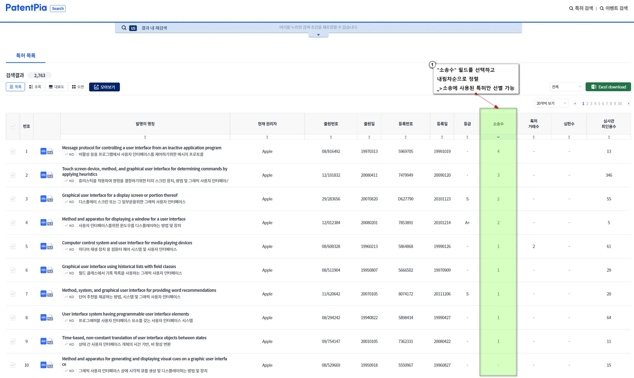 예시된 검색 결과 화면에서 “소송수” 내림차순으로 소팅합니다.