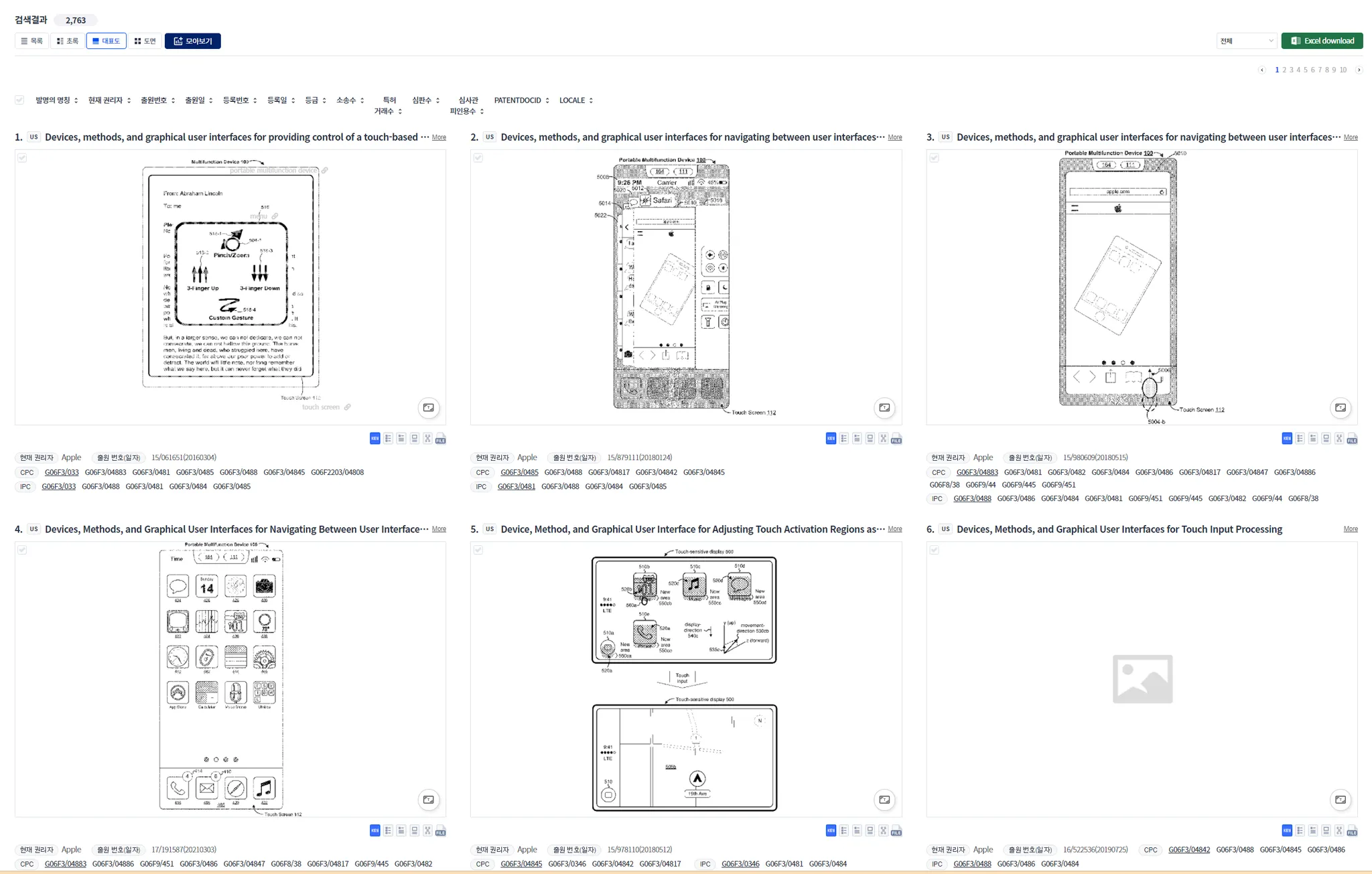 가장 일반적인 형태입니다. 소팅 등을 통하여, 특별한 특허를 찾거나, 발명의 명칭만 보고 빠르게 스캐닝하는 목적으로는 “목록형” 모드가 좋습니다.