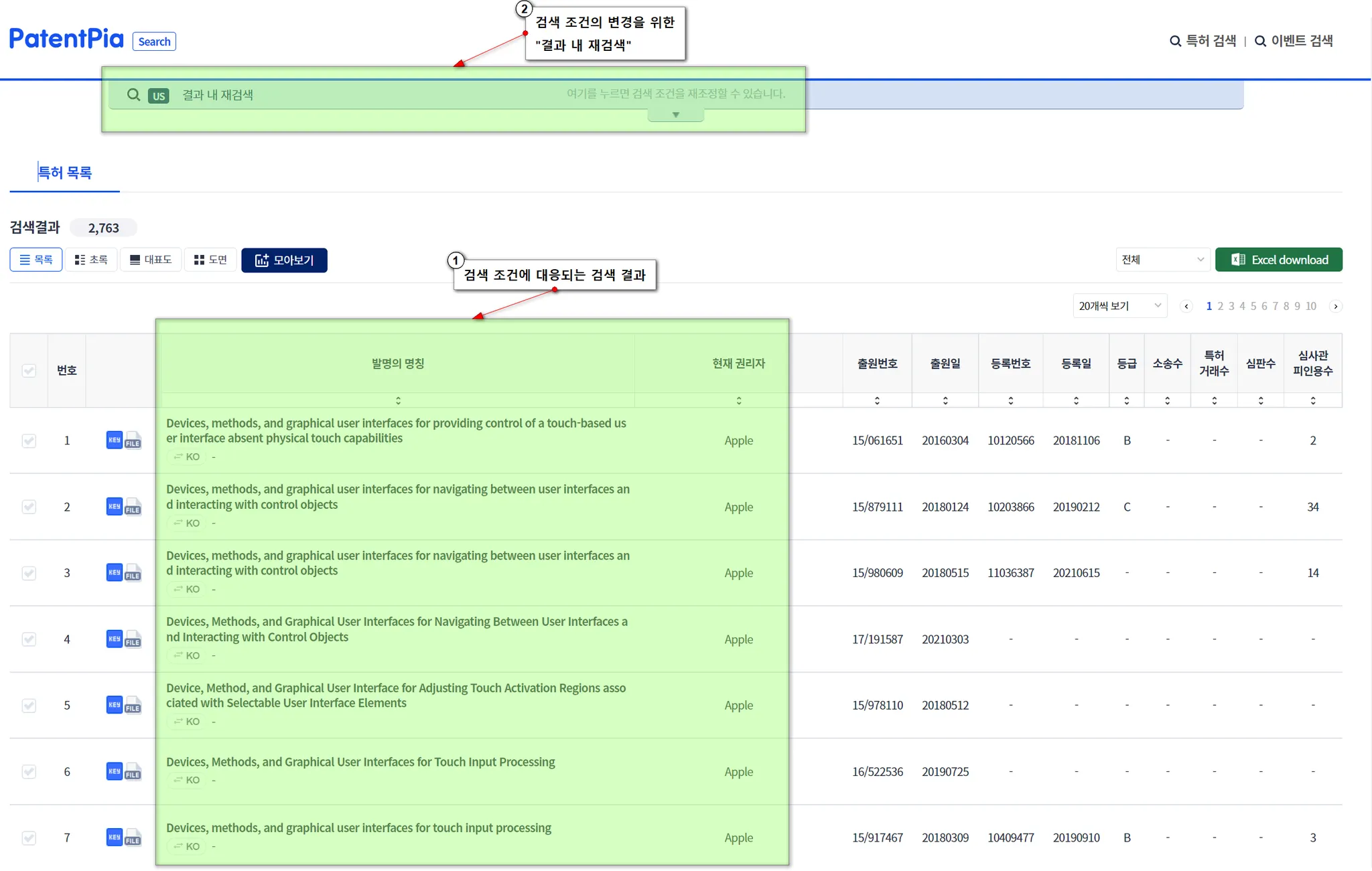 기존 검색 조건에 더하여, “소송수”가 “1 이상”인 특허만이 검색되는 것과 같이, 변경된 검색 조건에 대응된 검색 결과가 생성됩니다.