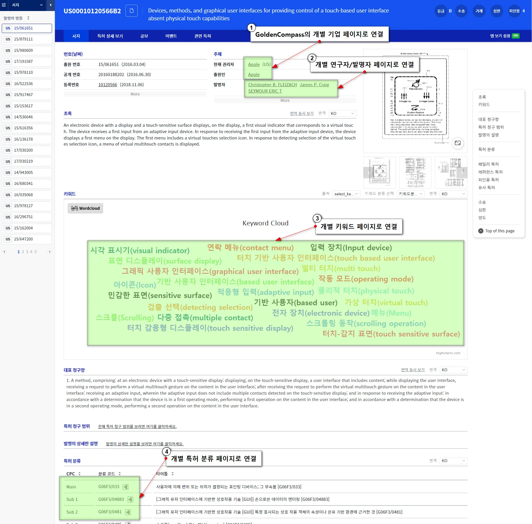 i) 특허 리스트 화면이나 ii) 개별 특허 페이지 화면에서, 그 화면에 나타나는 i) 현재 권리자/출원인 등의 주체, ii) 발명자, iii) 키워드, iv) 특허 분류, v) 대리인 등을 선택/클릭하면, GoldenCompass의 i) 개별 기업 페이지, ii) 개별 연구자 페이지, iii) 개별 키워드 페이지, iv) 개별 특허 분류 페이지, v) 개별 대리인 페이지로 연결됩니다.