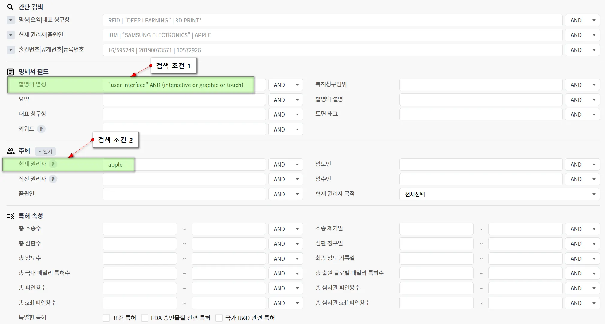 아래 예시는 PatentPia의 Patent Search 서비스의 “특별 가공 주체(권리자/발명자) 필드”를 보여 주는 화면입니다.