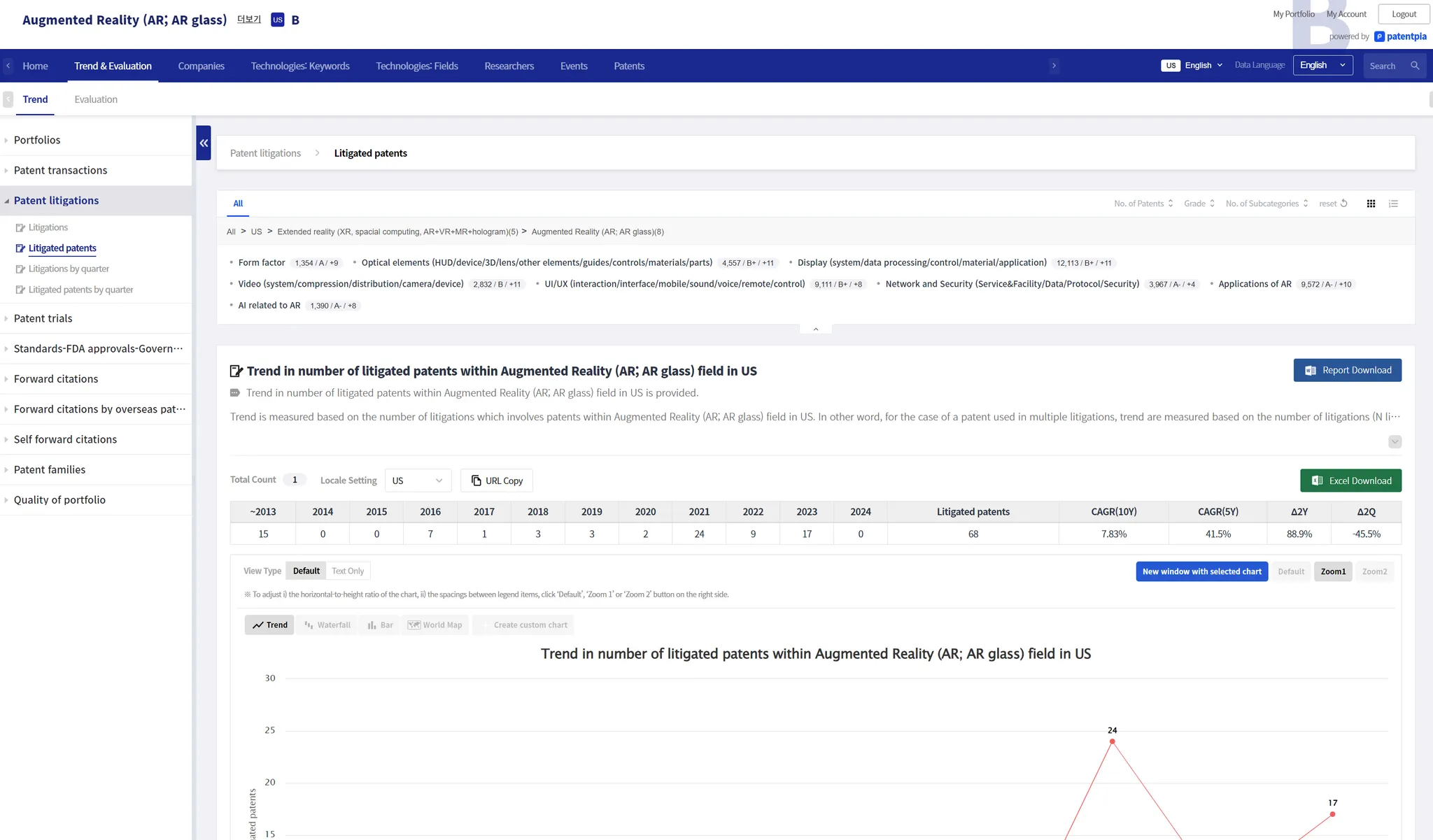 Below is the analysis contents of no. of litigations among events for the item of technonlogy field(input/selected) "Augmented reality".