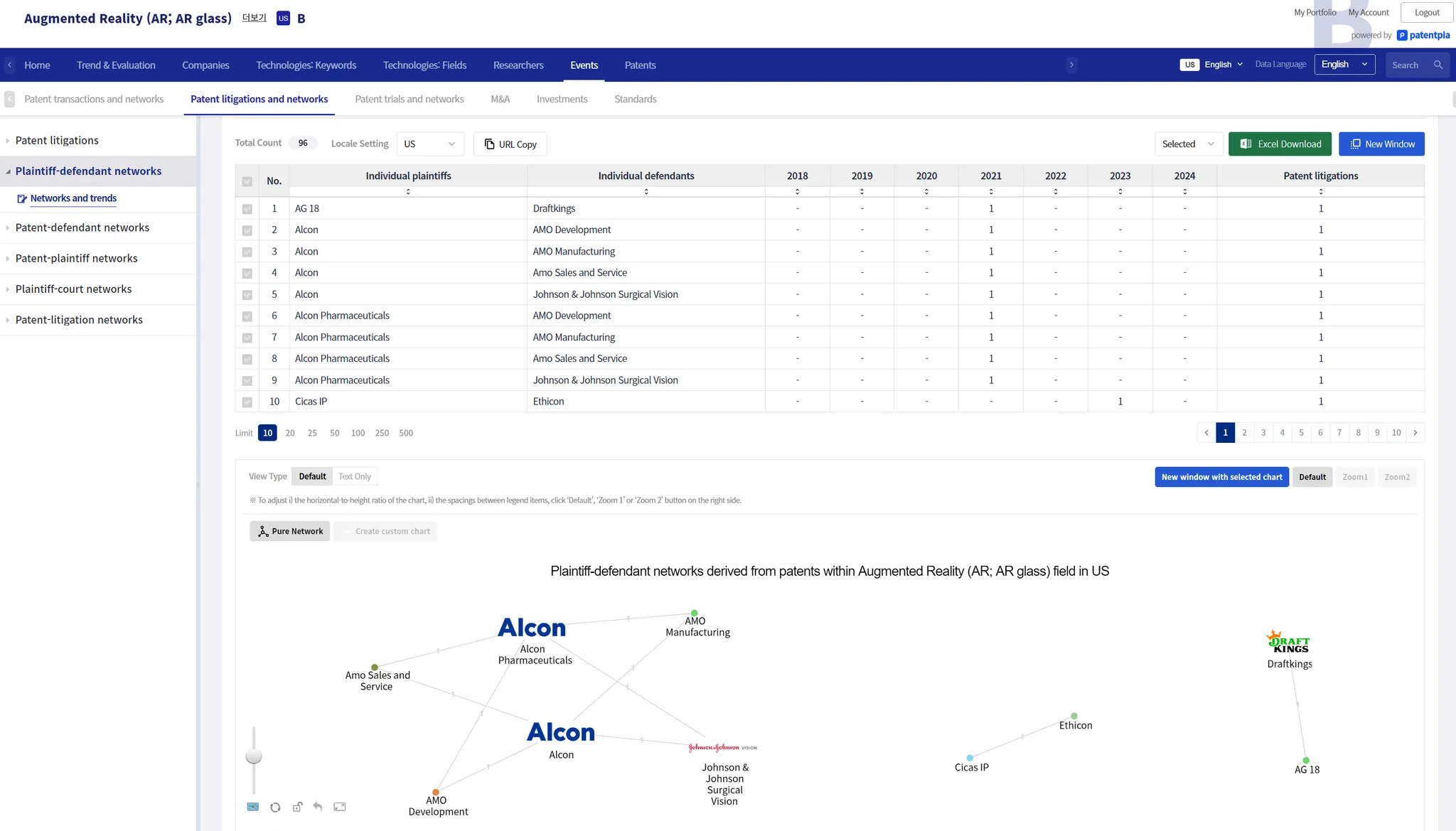 Below is a list of plaintiff-defendant networks that are parties to litigation events for the the item of technology field(input/selected) "Augmented reality".