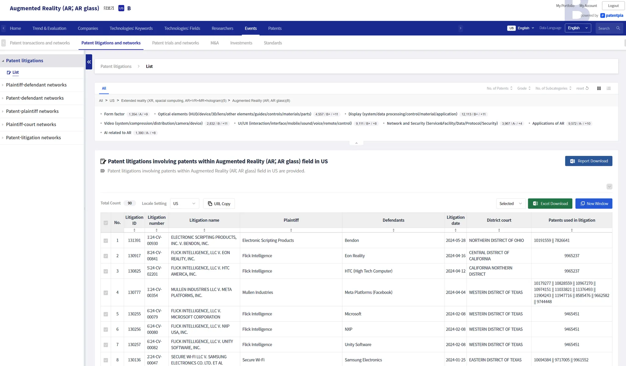 Below is a list of litigation events for the the item of technology field(input/selected) "Augmented reality".