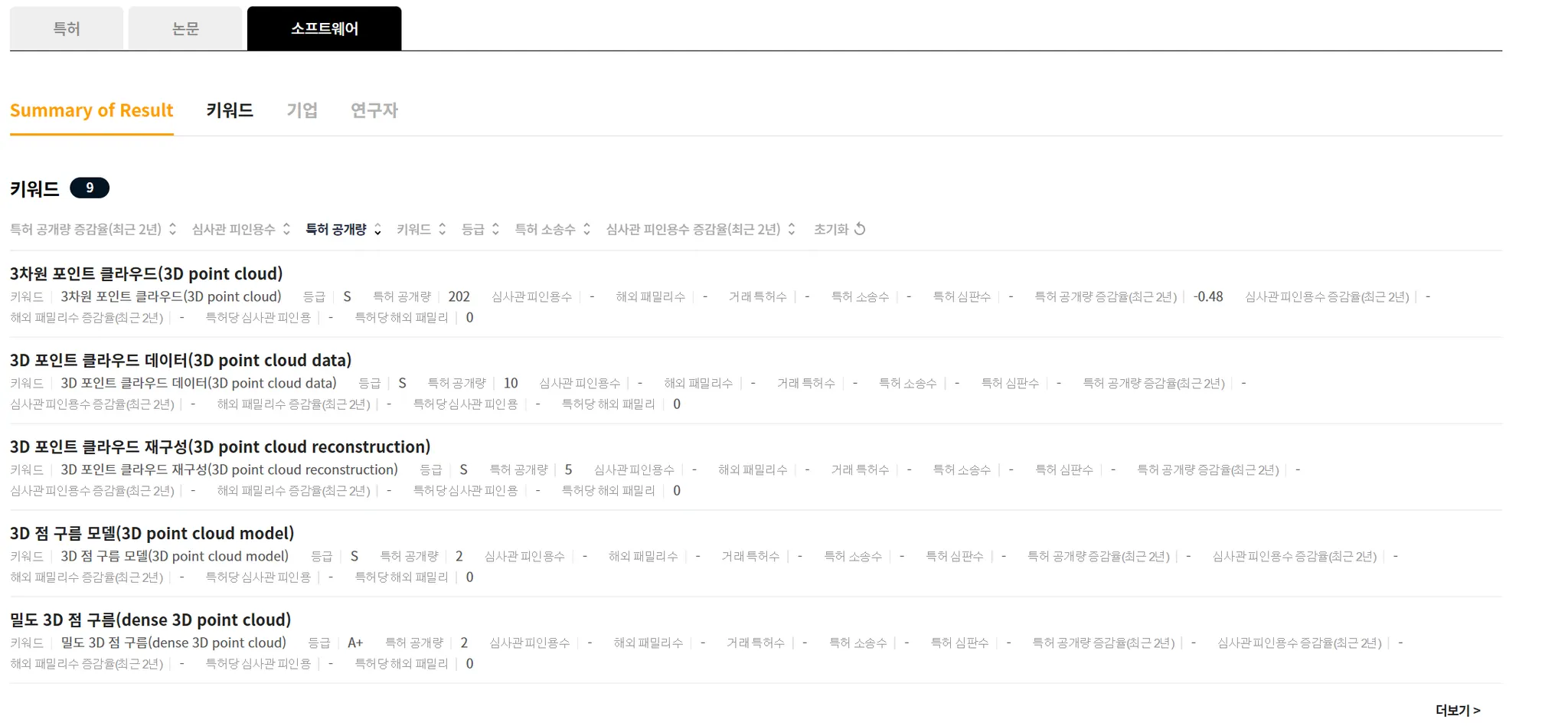 아래는 ‘3D point cloud’를 입력했을 때의, 특허 검색 결과의 예시입니다.