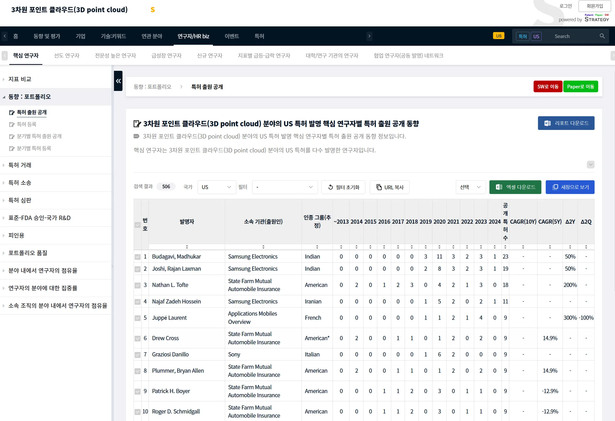 아래는 ‘3D point cloud’를 입력했을 때의, 이 분야의 특허를 발명한 핵심 연구자에 대한 특허 분석 결과의 예시입니다.