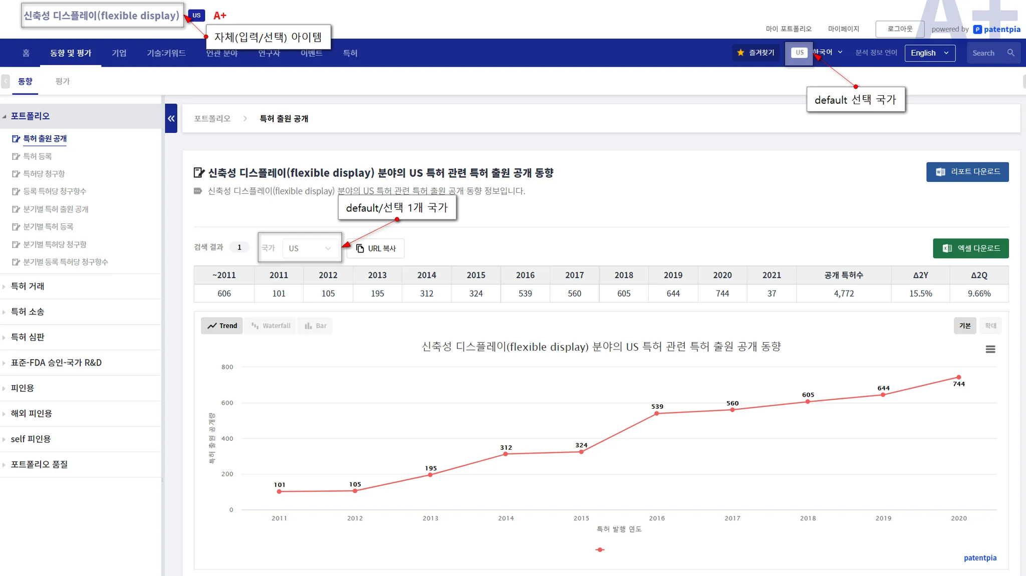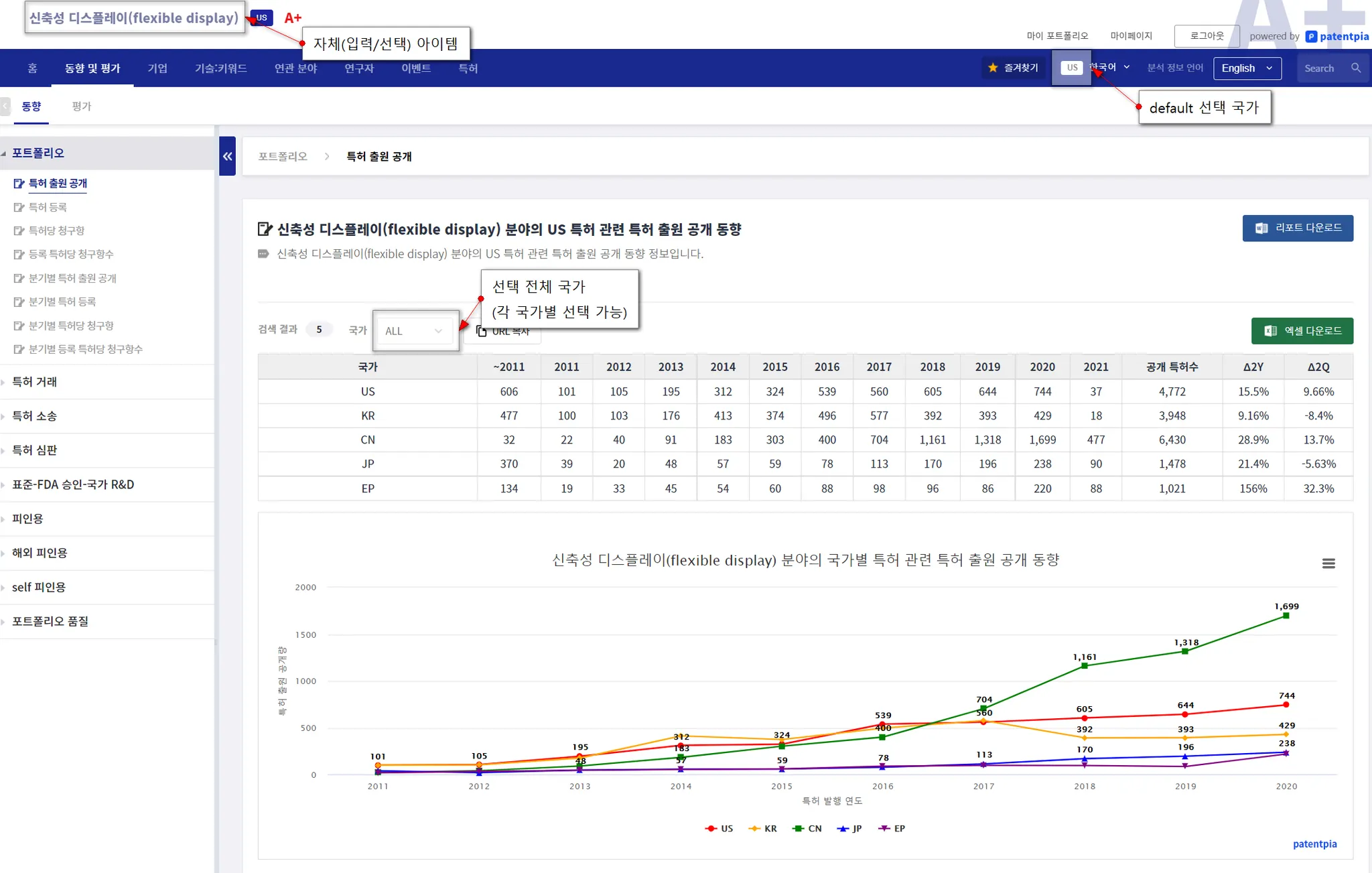 분석 대상 국가 전환은 키워드/기술 분야/제품-부품 분야/소재-물질 분야/특허 분류(CPC/IPC 등)/컨셉 분야 등과 같은 ii) 분야(field) 아이템에 대해서는 국가별 비교가 100% 지원됩니다. 다만, 기업/연구자/로펌 등과 같은 i) 주체(entity) 아이템 중, 기업에 대해서는 특허를 다량으로 보유하고 있는 글로벌 대기업/각 국가의 상장 기업/특별한 테마 관련 기업 중심으로 국가 비교가 가능한 기업군을 확대해 가고 있습니다.