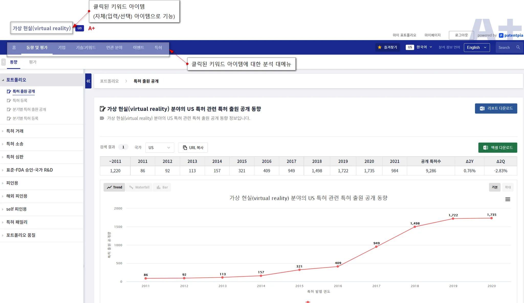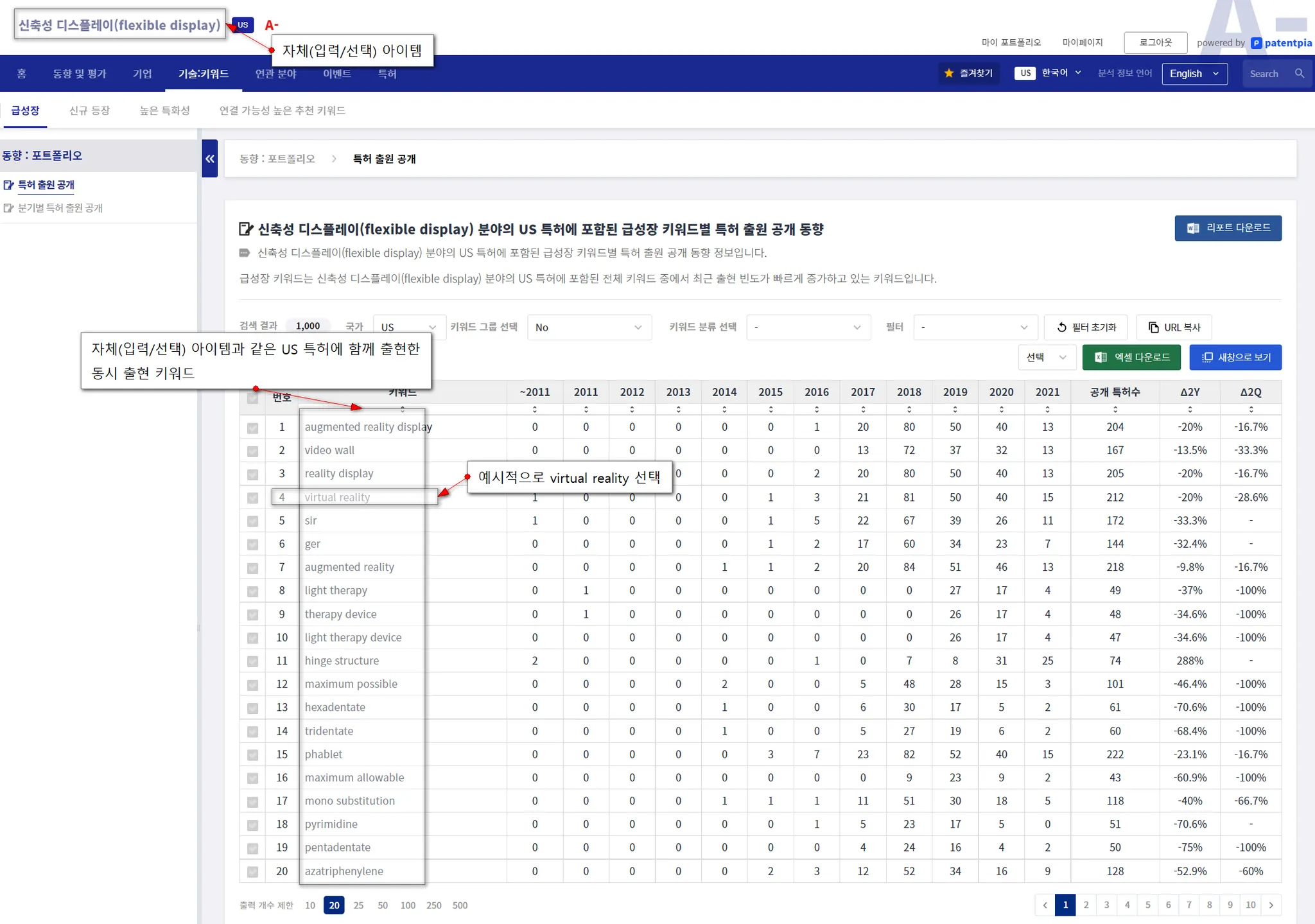 (참고) "flexible display"와 "virtual reality"가 동시에 나온 US 특허 전체를 알고 싶을 수 있습니다. 이 목적을 달성하기 위해서는 i) 숫자 클릭 기능, ii) PatentPia Search 서비스를 활용하는 방법이 있습니다. 특별한 제약 조건 없이 빠르게 US 특허 전체를 알기 위해서는 숫자 클릭 기능을 활용하면 됩니다. 이 경우, "virtual reality" 행에 있는 숫자를 클릭하면 됩니다.(coming soon) PatentPia Search 기능을 활용하려면, step 1) PatentPia Search 페이지에 접속, step 2) 검색어 입력 필드 중 "키워드" 필드에 "flexible display"와 "virtual reality"를 "AND" 조건으로 입력("flexible display" and "virtual reality")하면 됩니다.