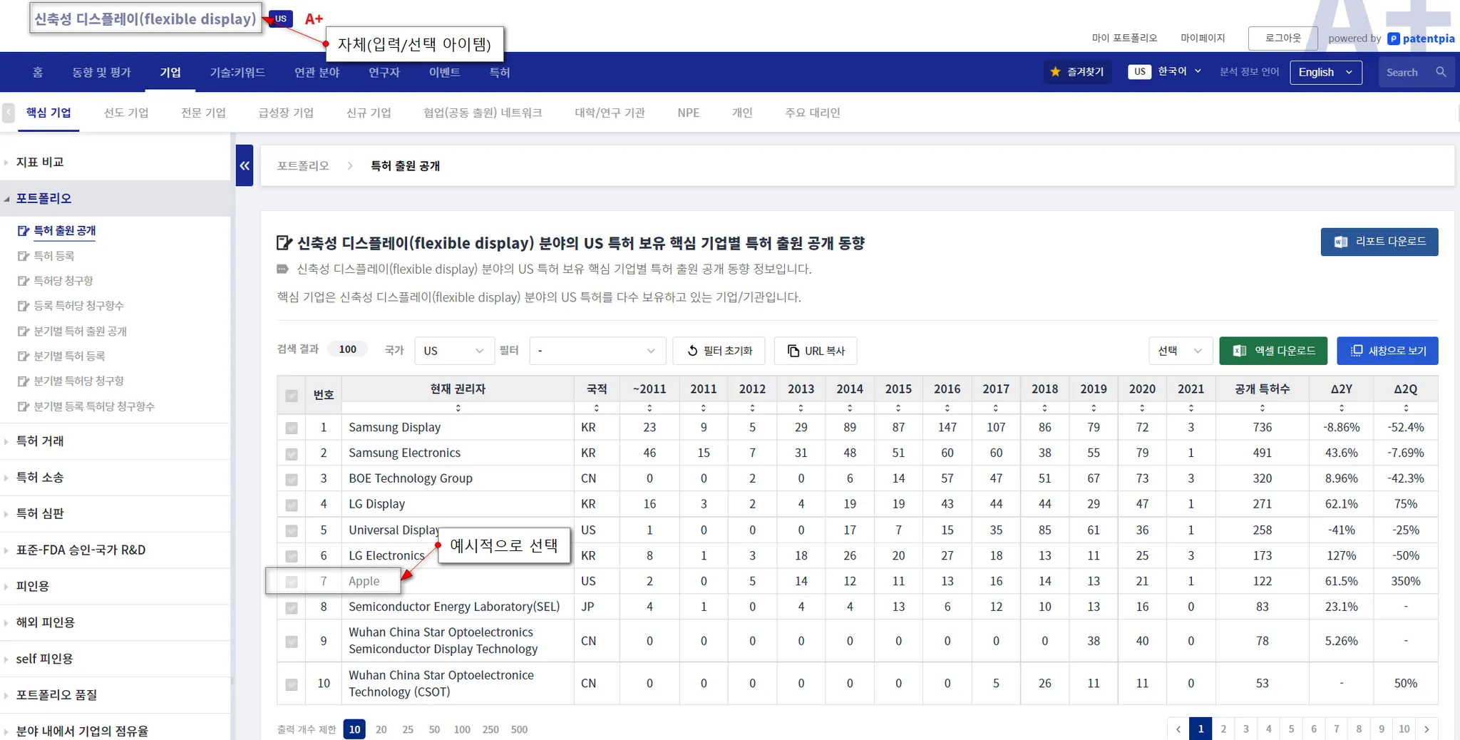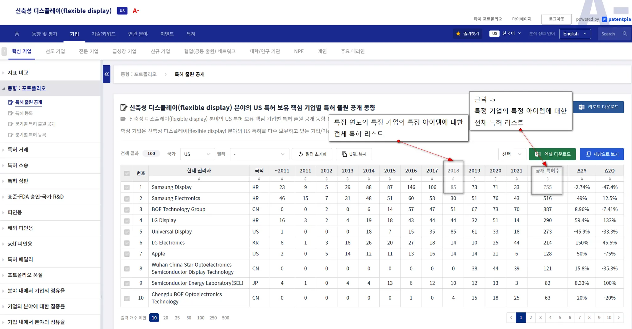 예를 들어, "집중률" 필드를 기준으로 내림차순 소팅하면, 집중률이 높은 기업이 나타납니다. 집중률이 높은 기업이란, 특정 기업이 보유하고 있는 특정 국가의 전체 특허 중에서 특정 분야(여기서는 "flexible display") 특허의 비중이 높은 기업입니다. 즉, 이 분야에 집중하고 있어, 전문성이 높은 기업일 가능성(특히, 보유 전체 특허수도 많고, 과거부터 꾸준하게 특허를 축적해 왔다면) 이 높습니다.