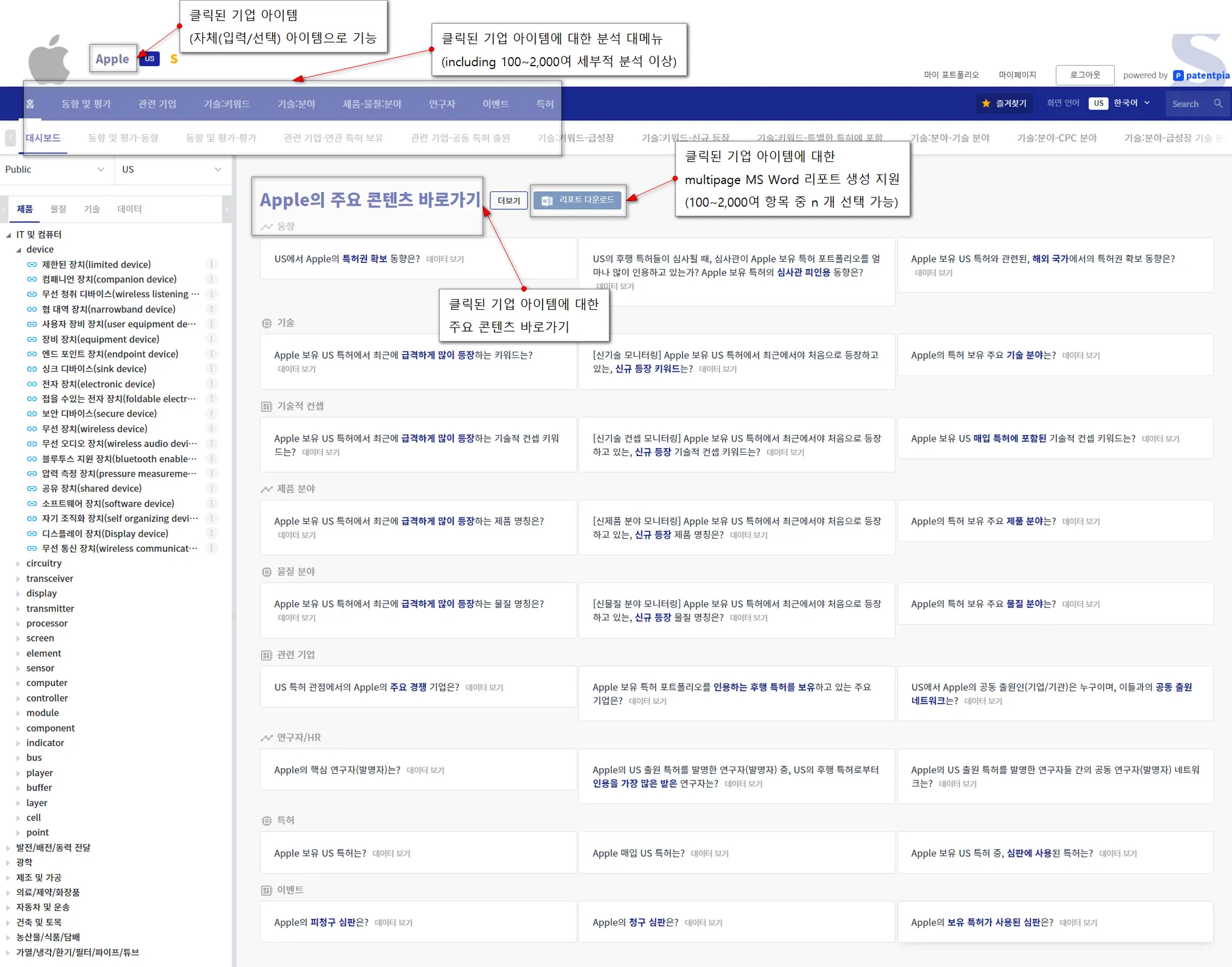 연관 기업 분석 콘텐츠 | 기업별 경쟁 기업, 인용-거절 관점에서 연관성 높은 기업, 협업 네트워크를 분석함. 발명자별로 연관성 높은 기업을 분석하여, HR/리크루팅에 활용할 수 있음. | Yes | No | No | ||