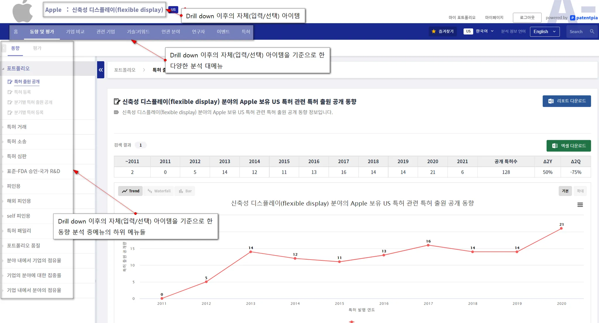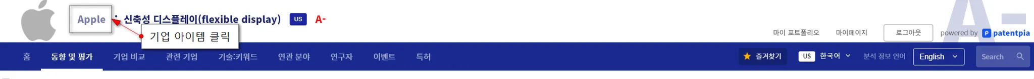 Drill down된 페이지에서 상위 아이템의 페이지로 원클릭만으로 이동할 수 있습니다. 복합 아이템을 대상으로하는 "Apple의 flexible display" 페이지에서는 2개의 상위 아이템가 존재합니다. 하나는 키워드 아이템인 "flexible display"이며, 다른 하나는 기업 아이템인 "Apple"입니다.