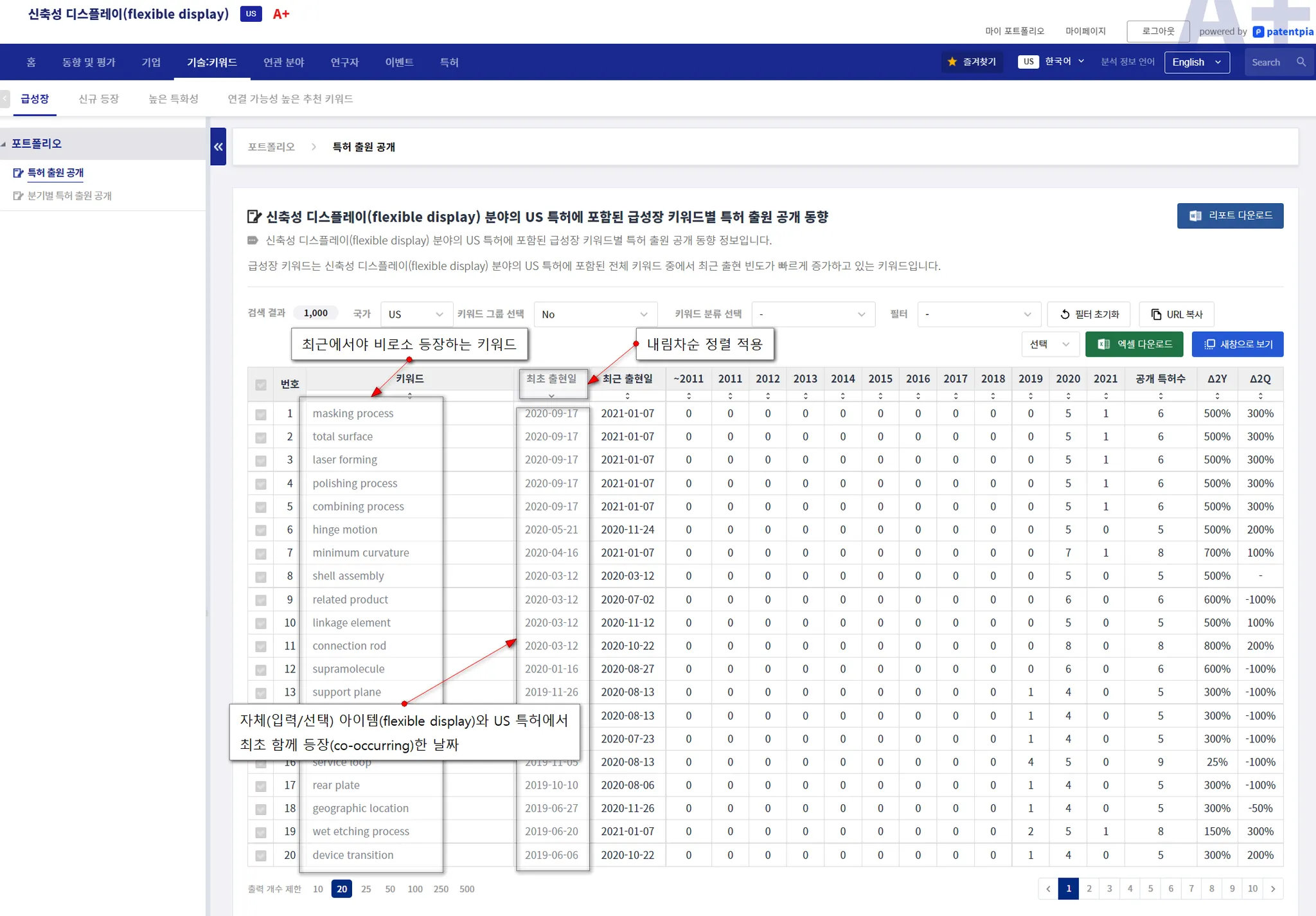 키워드 분석 화면 등에서는 "최초 출현일"이나 "최근 출현일"이 나타납니다. "최초 출현일"을 역순으로 선택하면, 가장 최근에서야 비로소 등장하는 키워드 등의 아이템이 나타납니다. 키워드 분석 화면에 이 소팅을 적용하면, 원 클릭만으로 테크 센싱 결과를 획득할 수 있습니다.
