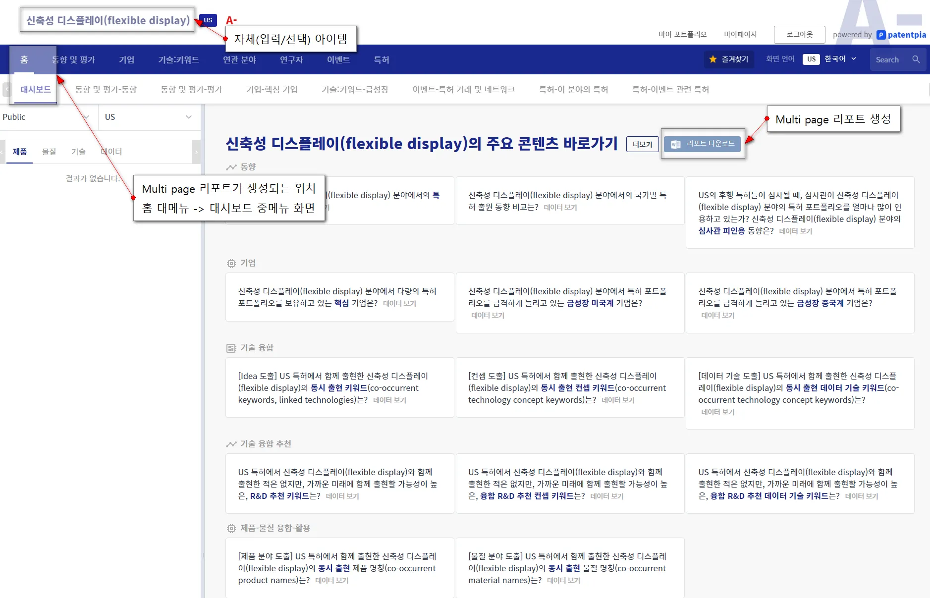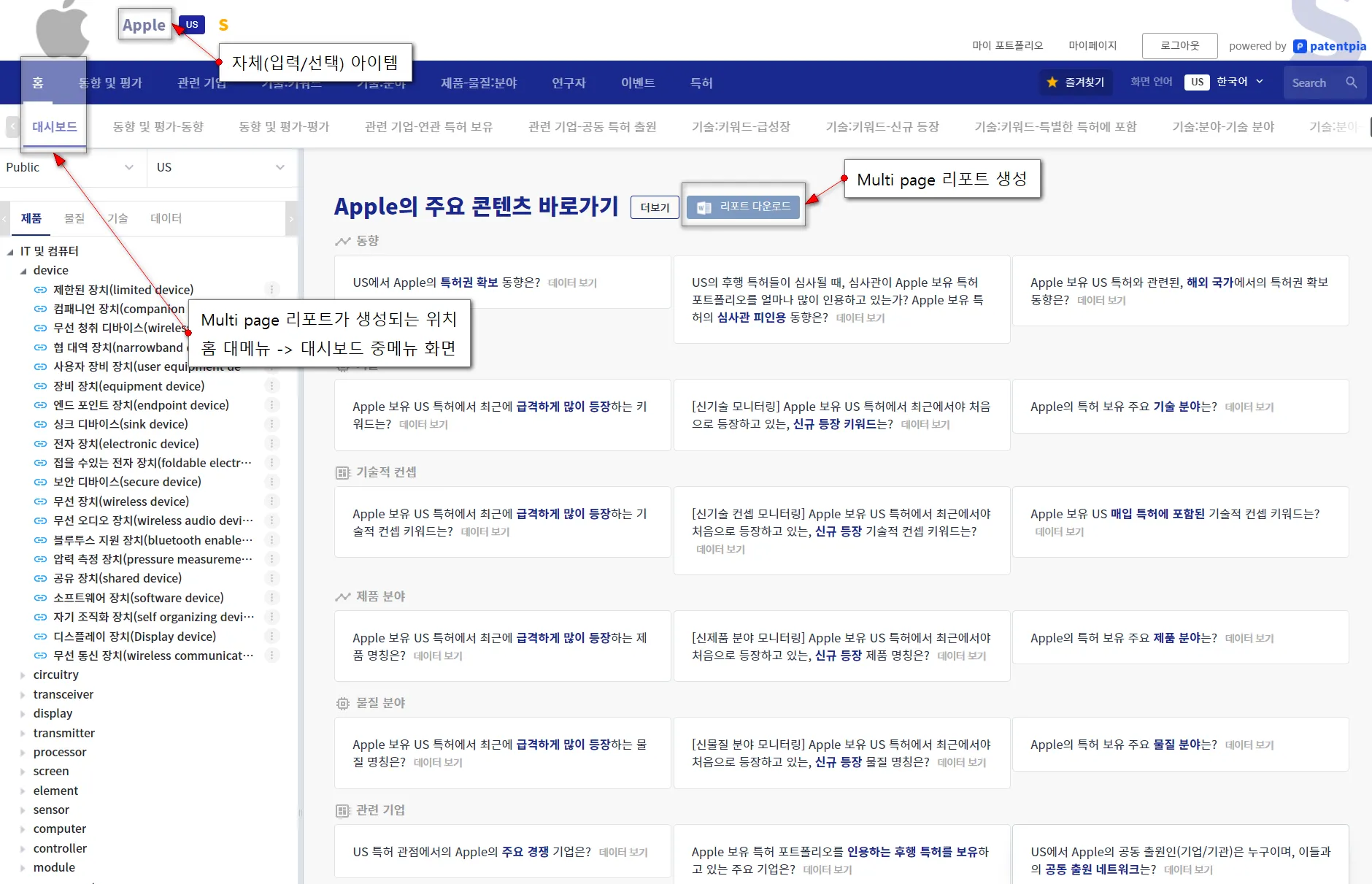 Multi page 리포트는 i) 아이템 단위로 제공되며, ii) 리포트 항목 pool 중에서 사용자가 선택하는 복수 개의 리포트 항목으로 생성됩니다. 아이템은 "기업(예, Apple)", "키워드(예, flexible display)", "기술 분류", "특허 분류", "연구자" 등의 단일 아이템과 2개의 단일 아이템이 결합된 복합 아이템(예, Apple의 flexible display)이 있습니다.
