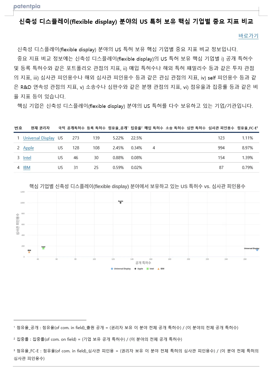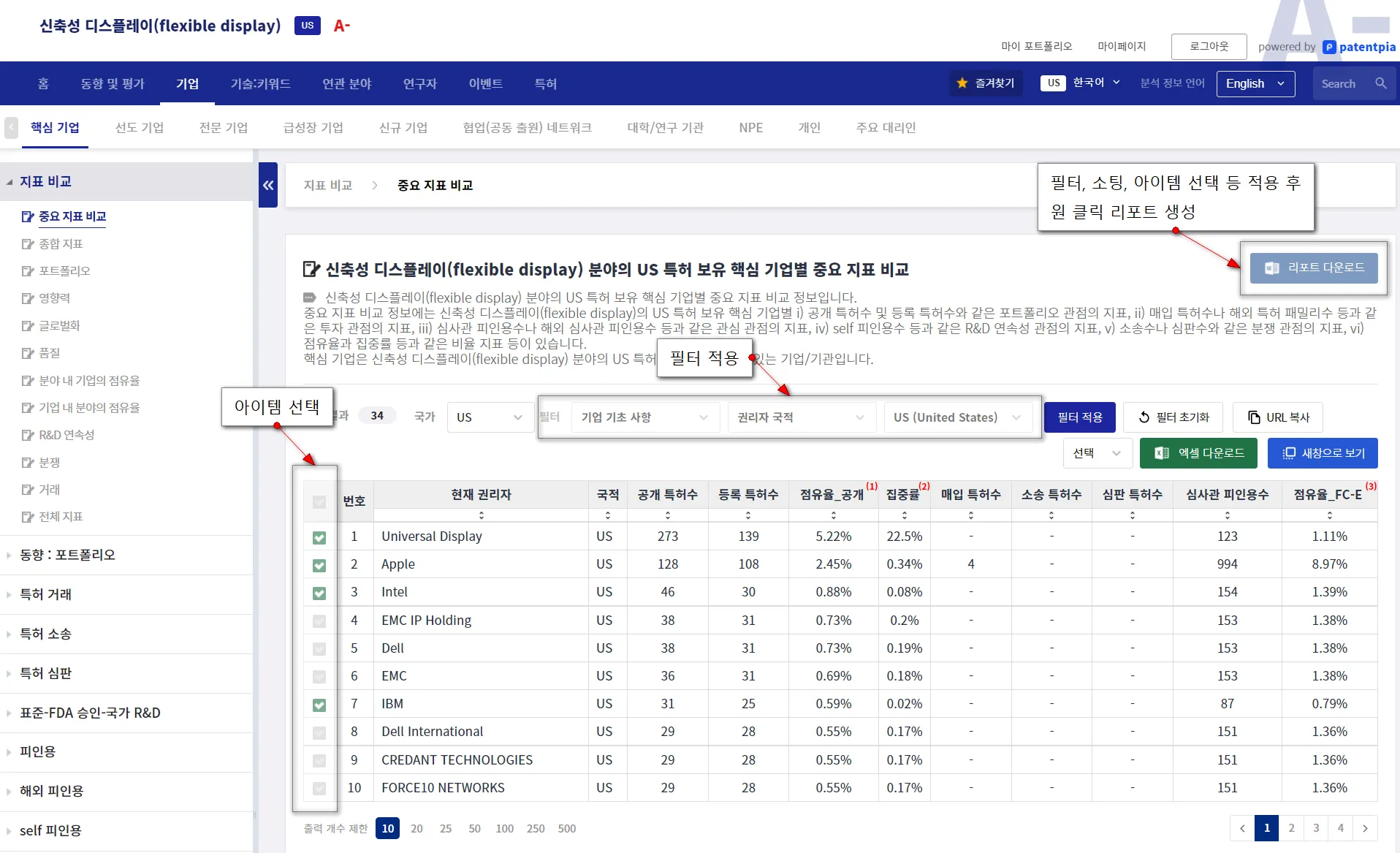 리포트 모드는 "기업(예, Apple)", "키워드(예, flexible display)", "기술 분류", "특허 분류", "연구자" 등의 단일 아이템에 대한 것과 2개의 단일 아이템이 결합된 복합 아이템(예, Apple의 flexible display)에 대한 것이 있습니다.
