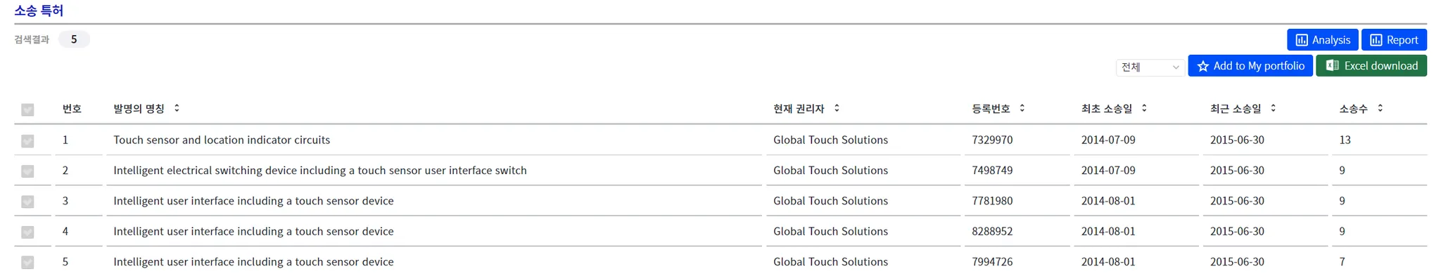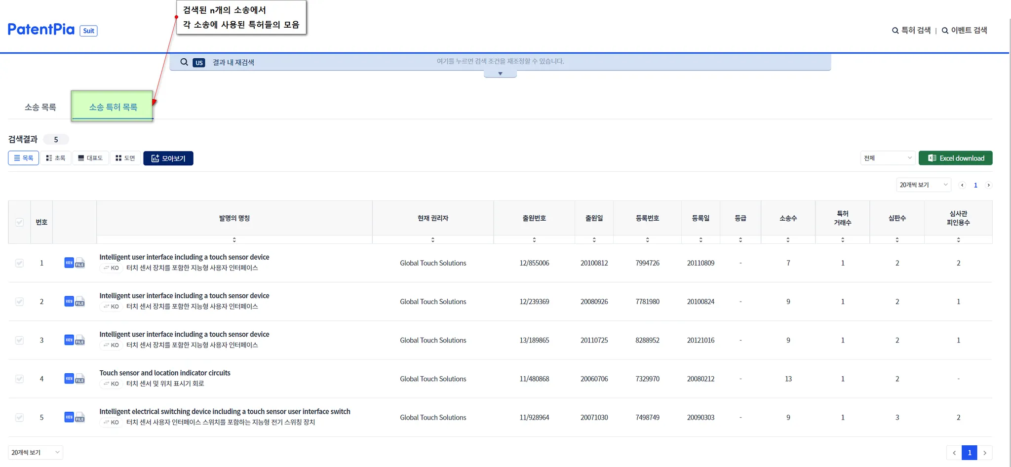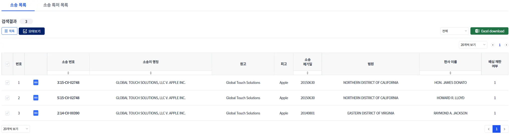 “소송 특허 목록”을 클릭하면, 검색된 1개 이상의 소송에 사용된 소송 특허를 모아서 출력해 줍니다.