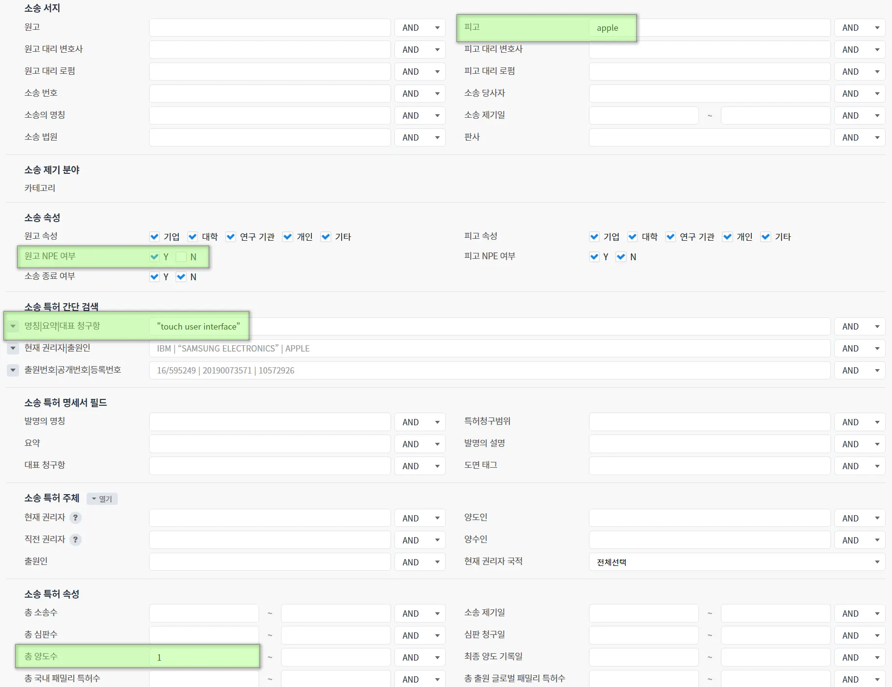 아래는 “소송 자체의 속성”과 “소송 특허의 속성”을 함께 활용하여 소송을 검색하는 예시입니다. NPE가 매입한 특허를 사용하여, “Apple”을 대상으로 제기한 소송 중에서, 그 소송에 사용된 특허의 “명칭 또는 요약 또는 대표 청구항” 영역에 “touch user interface”를 포함하고 있는 소송을 검색합니다.