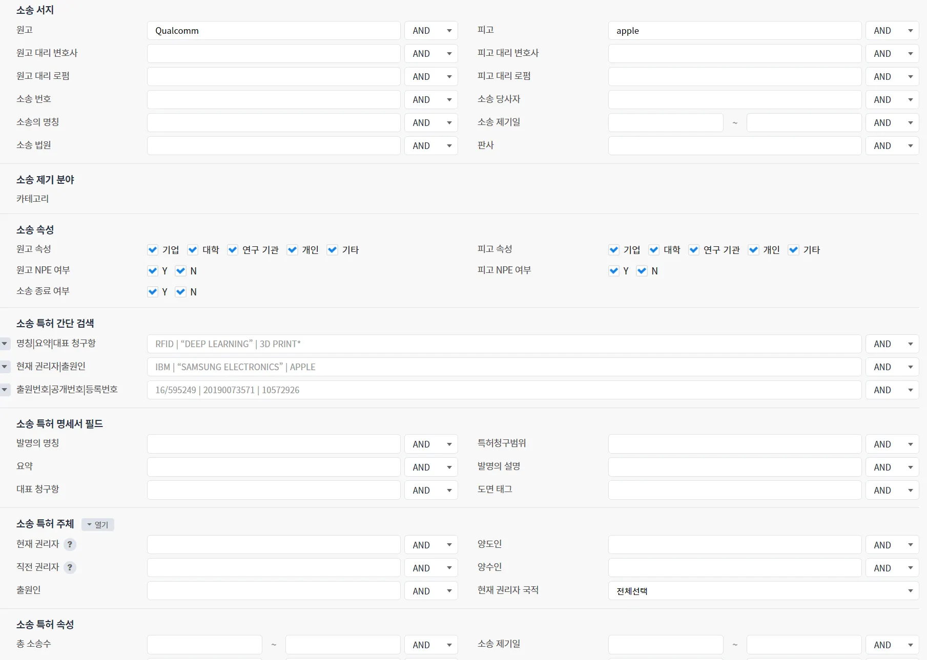 아래는 “소송 자체의 속성”으로 Qualcomm이 Apple을 상대로 제기한 소송을 검색하는 예시입니다. “원고” 필드에 “Qualcomm” 입력하고, “피고” 필드에 “Apple”을 입력합니다.