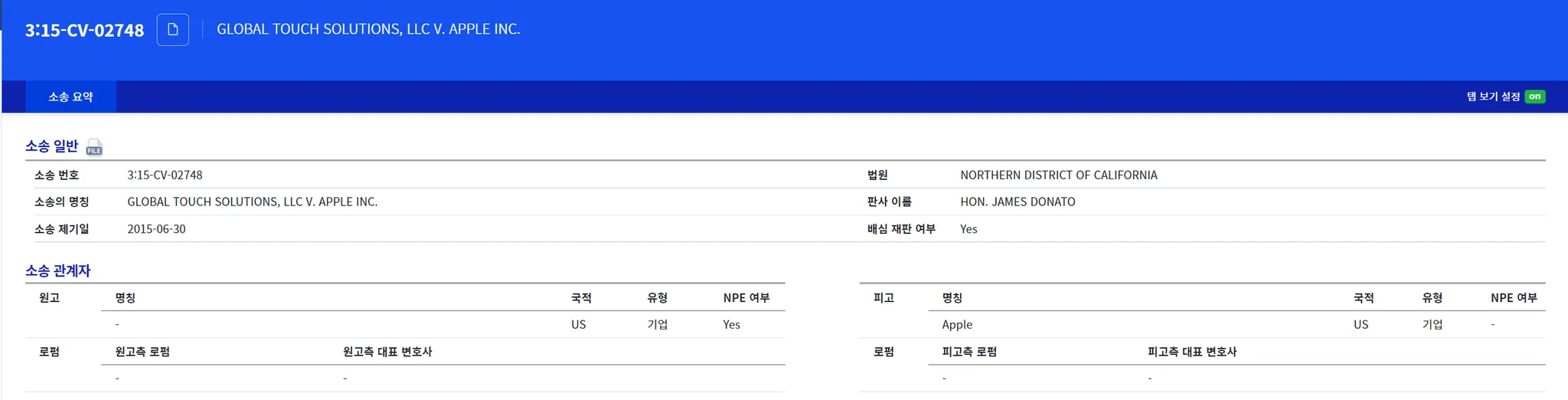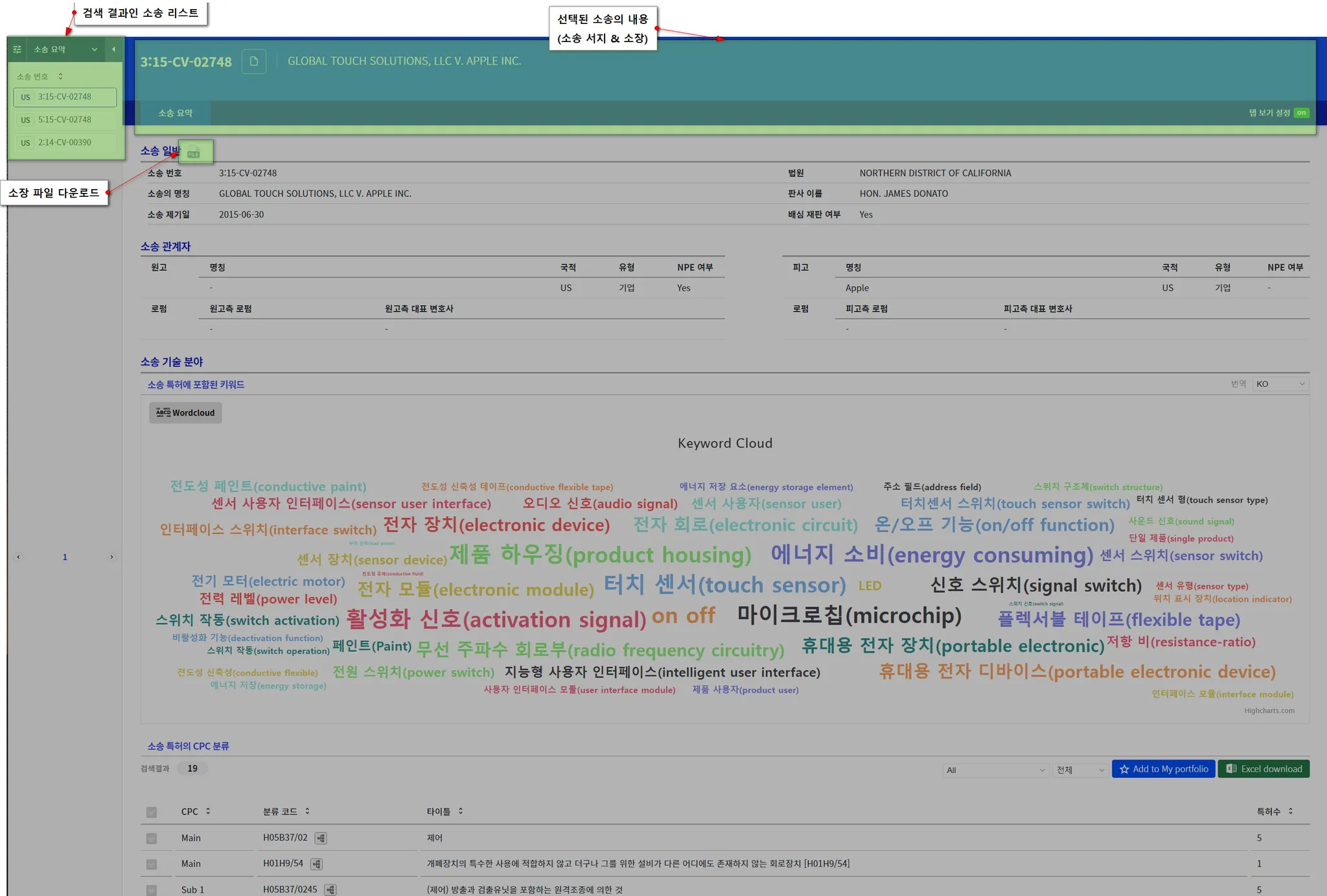 개별 소송 페이지에는 i) 소송 서지, ii) 소장 파일 등의 정보가 제공됩니다.