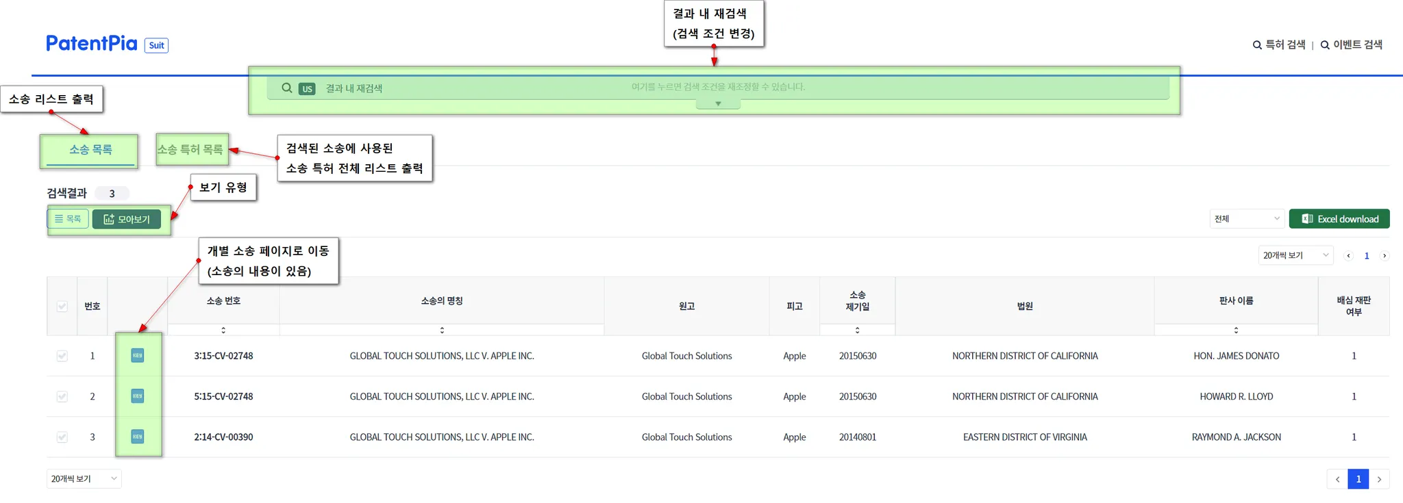 아래는 “목록” 모드로 제공되는 검색 결과 화면입니다. “목록” 모드에서는 “결과 내 검색”이 있어, 검색 조건을 변경할 수 있으며, 소송 리스트도 다운로드 받을 수 있습니다.