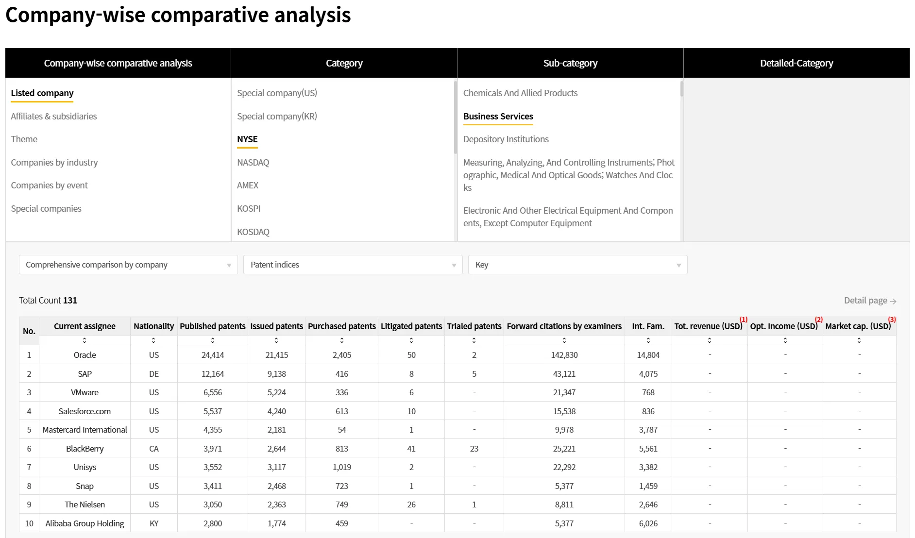After selecting the desired categorization, click “Detail page” to see a variety of analytics for companies that correspond to the selected categorization.
