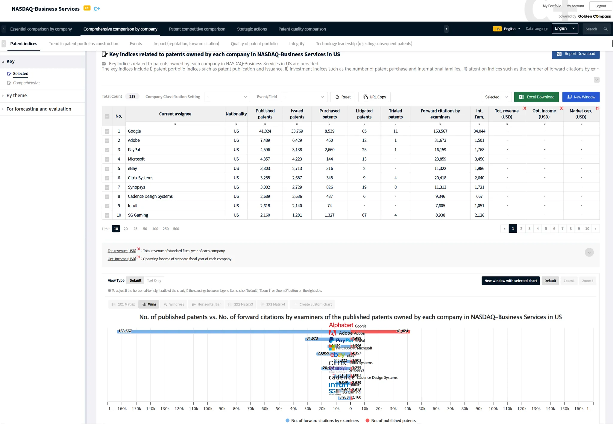 On the analysis results page, click on the various comparison analysis menus to see the results of the desired analysis. For listed companies, you will also be provided with: i) stock market data such as market capitalization, etc. and ii) financial data such as revenue, profit, etc. With these stock market data or financial data, you can create, share, and report on various charts. The charts can be created by clicking on the chart type menu (e.g., 2X2 Matrix, Wing, etc.).