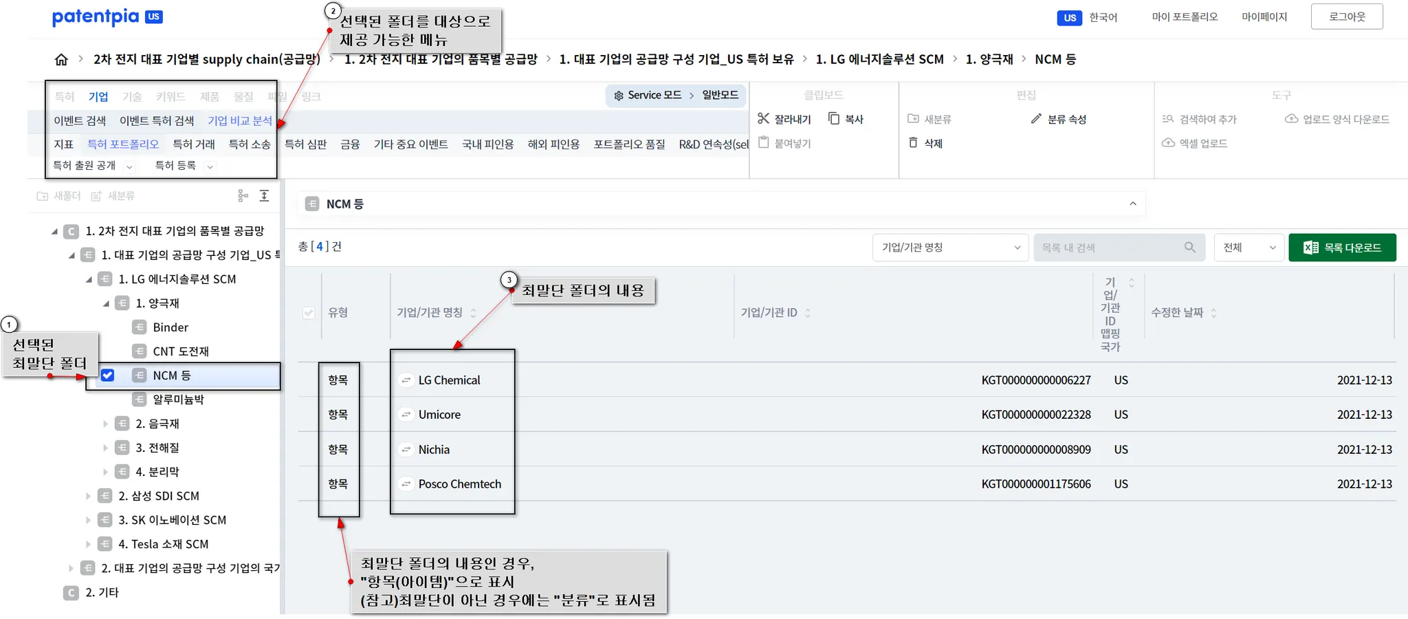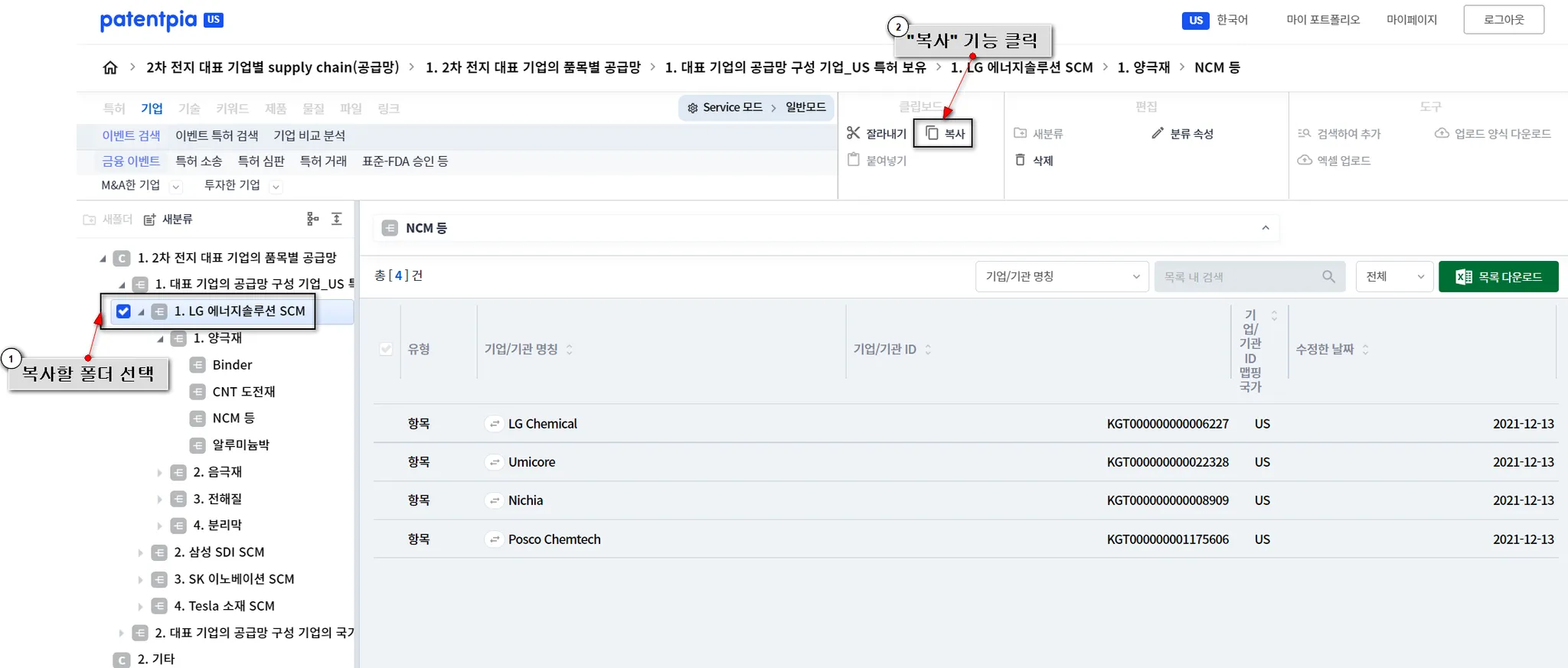 예시적으로, “아이템 등록 (계층형) 폴더 영역”의 특정 폴더(예, “1. LG 에너지솔루션 SCM” )를 복사한 다음, 다른 폴더(예, “2. 기타”)에 붙여 넣어 보겠습니다.