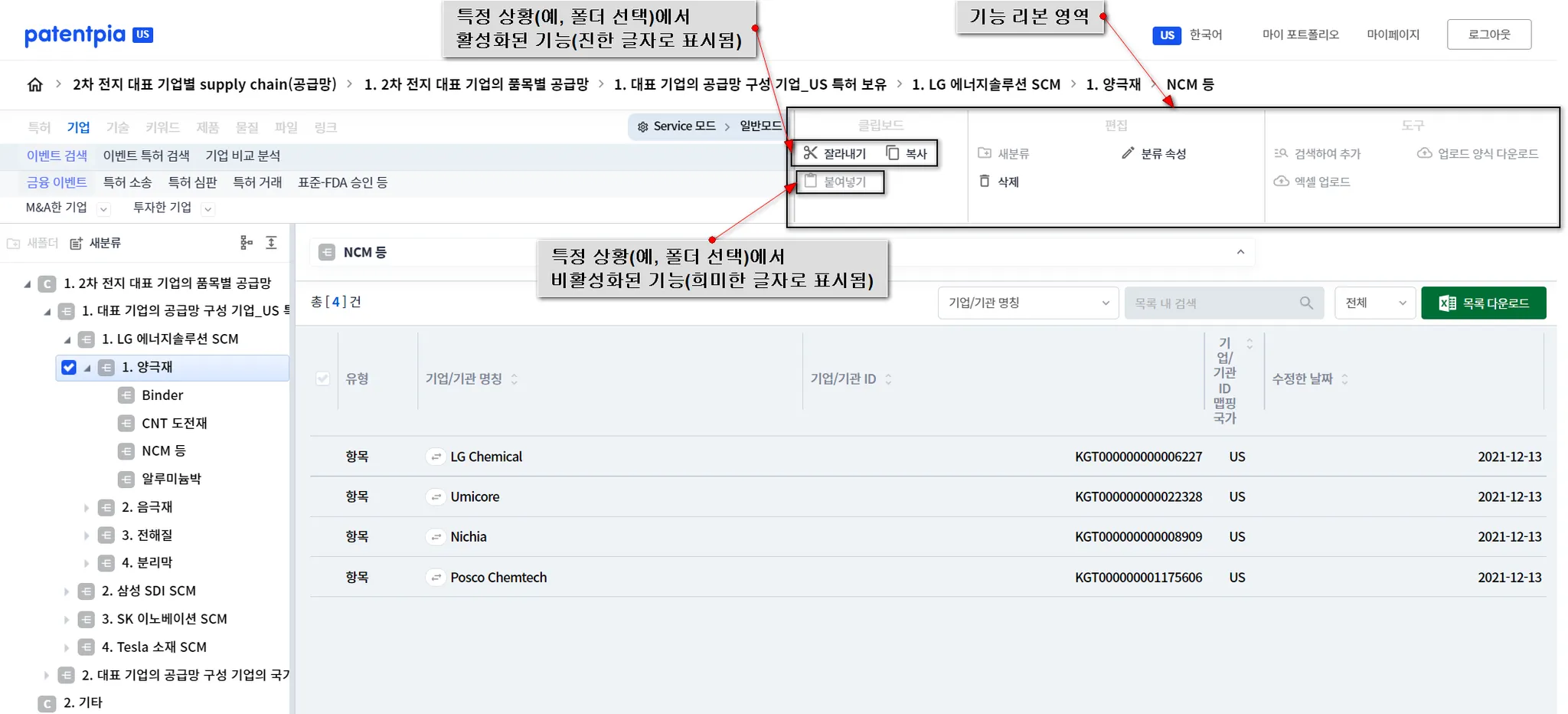 위의 예에서, “NCM 등” 폴더에 대응되는 기업 중 특정 기업 아이템(예, “Posco ChemTech”)을 선택하고, 복사한 다음, 특정한 폴더(예, “흑연”)을 선택하고 붙여 넣기를 실행할 수 있습니다.