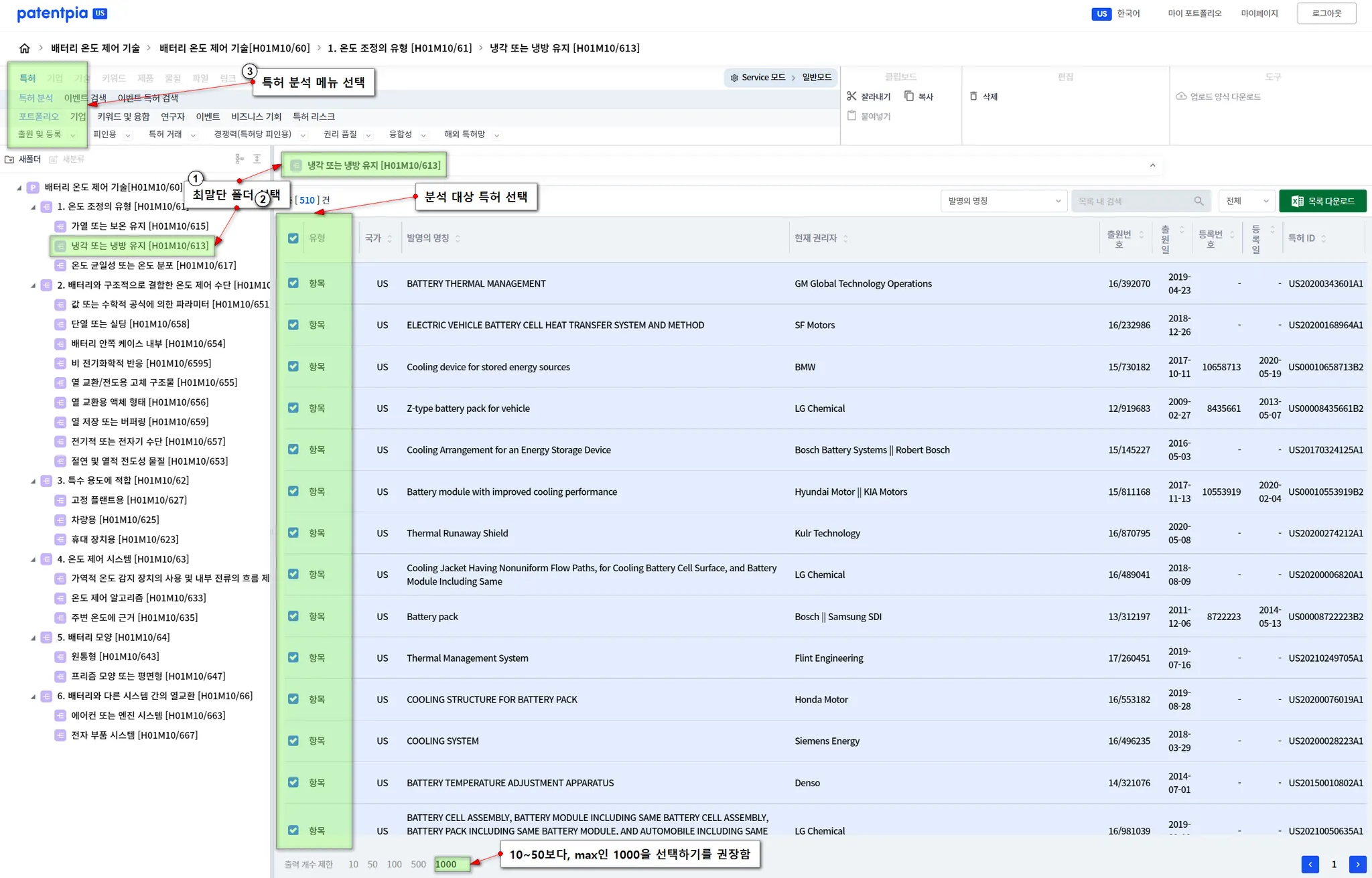 분석을 원하는 특허를 선택하는 것이므로, 내용 영역의 전체 특허를 선택할 수도 있습니다.
