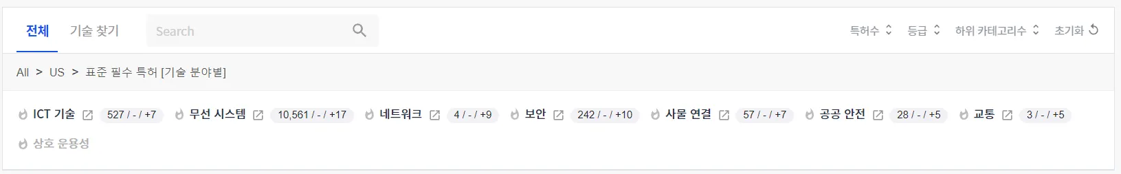 표준 필수 특허 [기술 분야별] 카테고리(분류)를 탐색합니다. 표준 필수 특허 [기술 분야별] 카테고리(분류)에는 i) ICT 기술, ii) 무선 시스템, iii) 네트워크, iv) 보안, v) 사물 연결, vi) 공공 안전, vii) 교통 등과 같은 하위 분류가 있습니다.