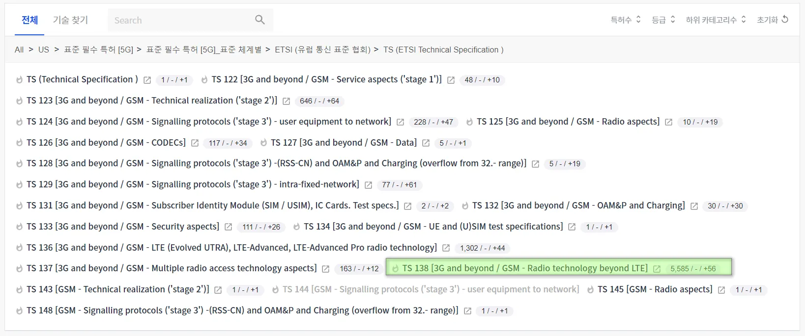 특허 표준도 다른 기술 카테고리(분류)처럼 계층형으로 콘텐츠가 제공됩니다. 예시적으로, “표준 필수 특허 [5G]”를 대상으로, 계층형 콘텐츠 제공 방식을 설명합니다.