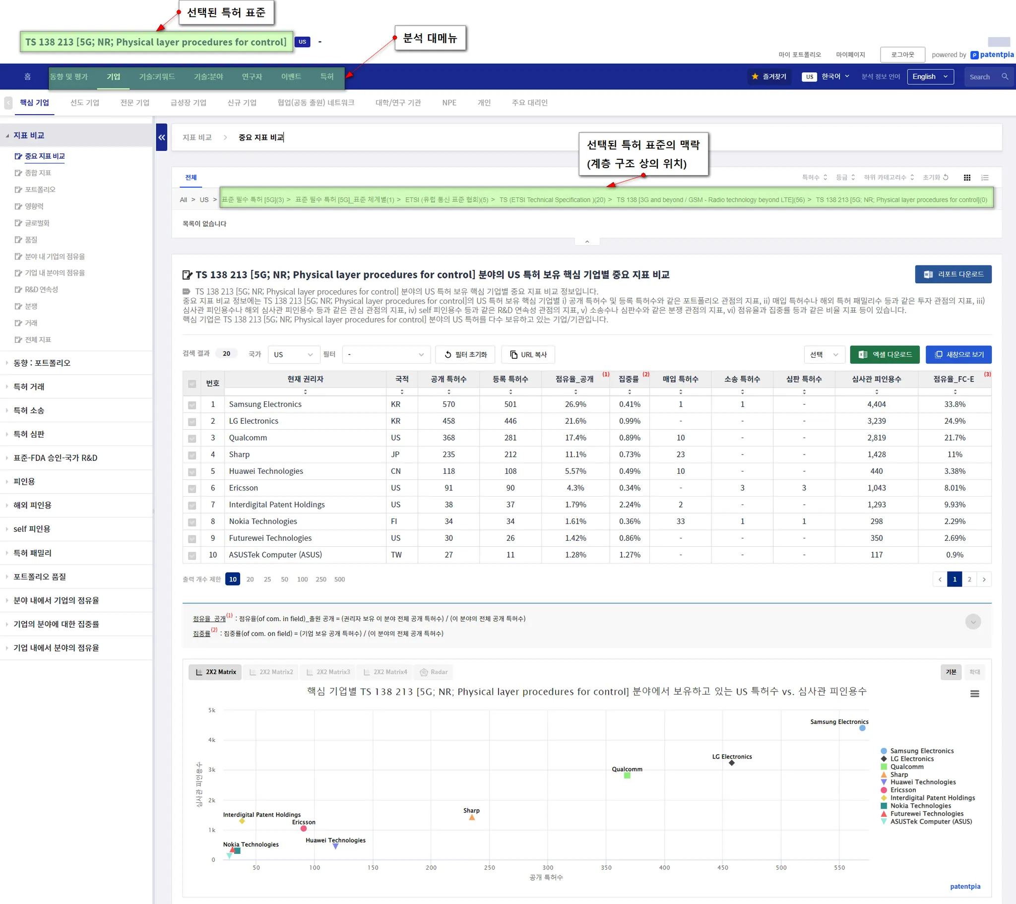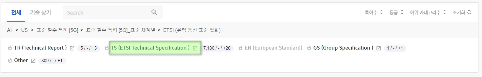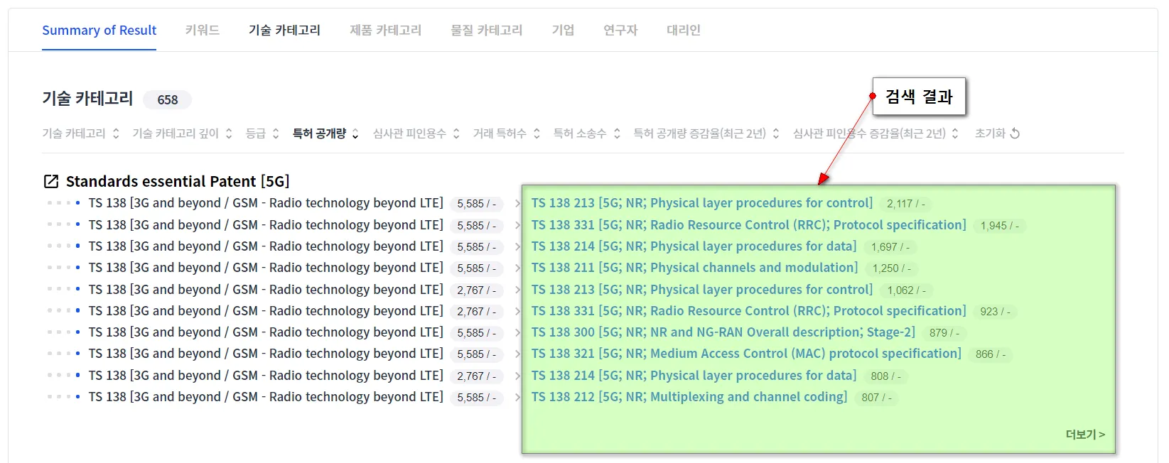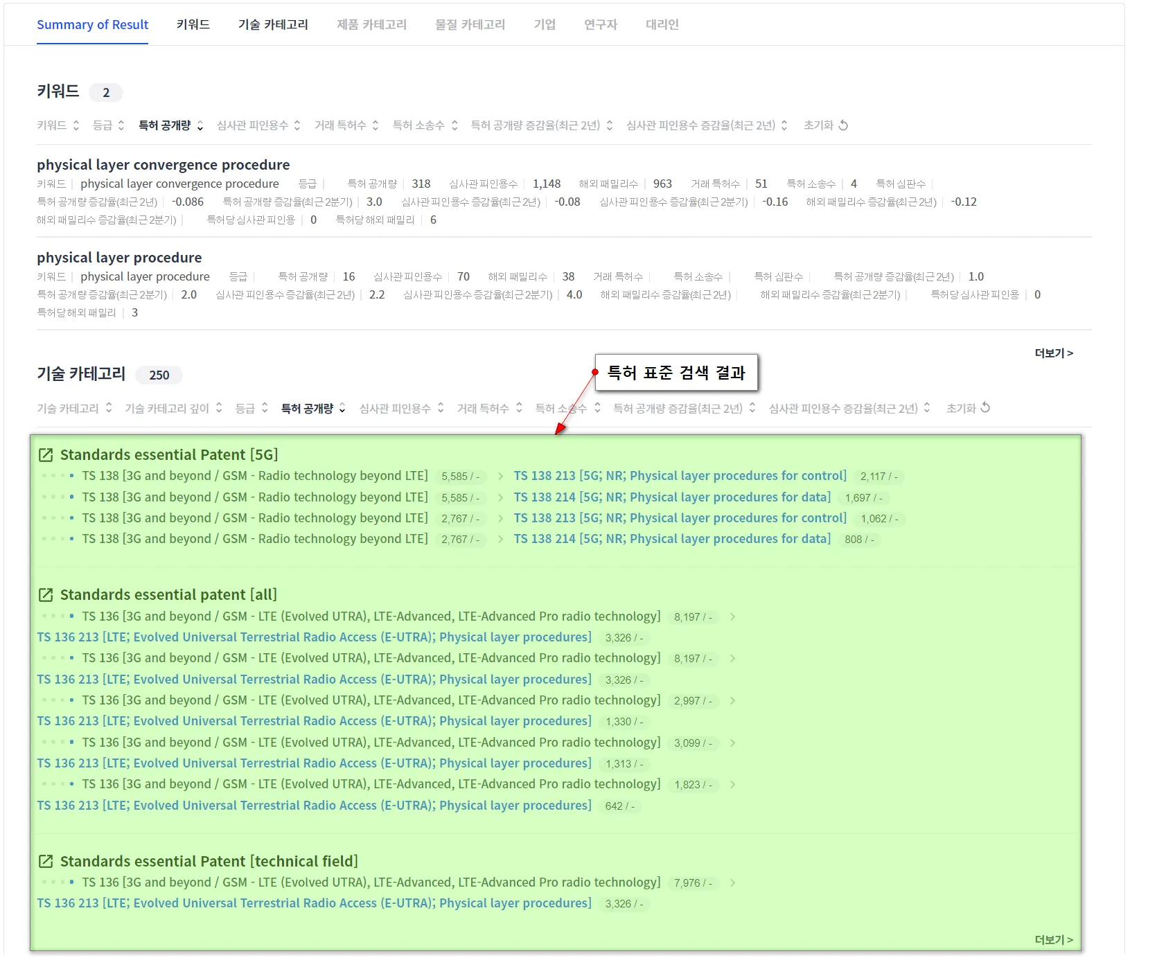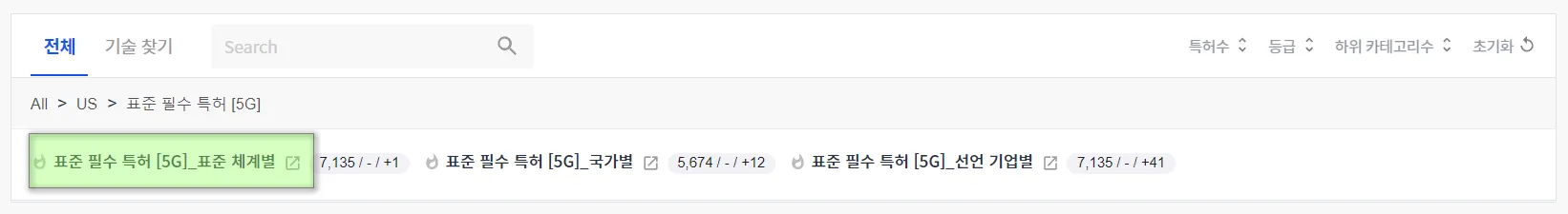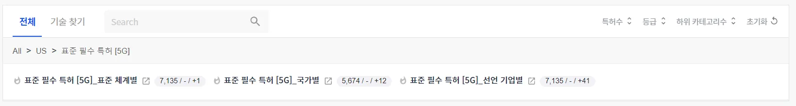 특허 표준에 대해서는 i) 표준 필수 특허 [5G], ii) 표준 필수 특허[기술 분야별], iii) 표준 필수 특허[all] 등의 목적별 카테고리(분류)가 있습니다.