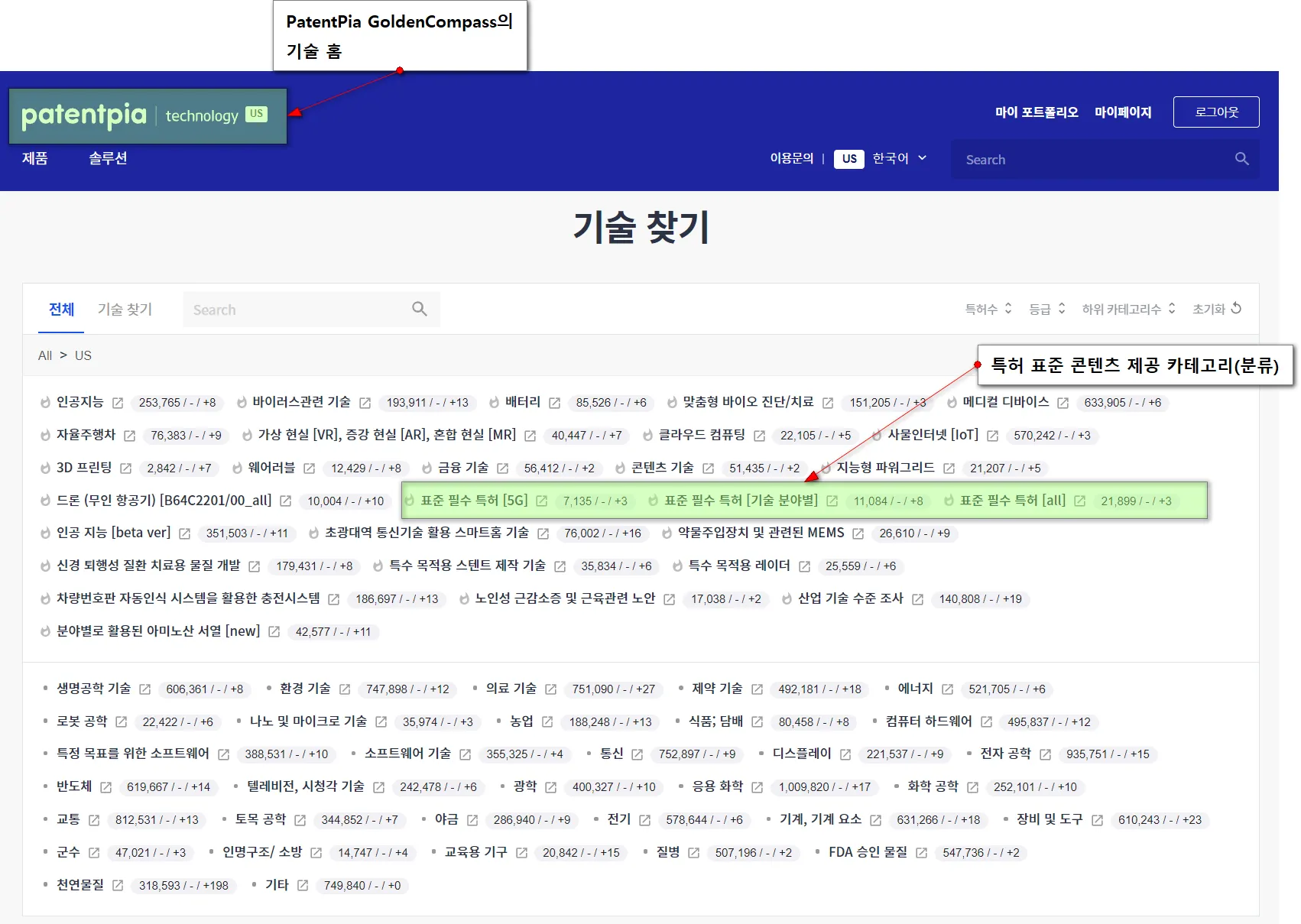 특허 표준을 찾아내는 방법은 i) 검색 트랙, ii) 계층형 카테고리 탐색(브라우징) 트랙이 있습니다. 검색 또는 탐색을 통하여, 목표하는 특허 표준을 1개 선택합니다. 선택된 특허 표준은 GoldenCompass의 기술 카테고리(분류)와 100% 일치하는 방식으로 동작합니다. 따라서, 선택된 특허 표준별로 1개의 특허 표준 홈 페이지(like 기술 분류 홈 페이지 또는 키워드 홈 페이지 등)가 제공됩니다.