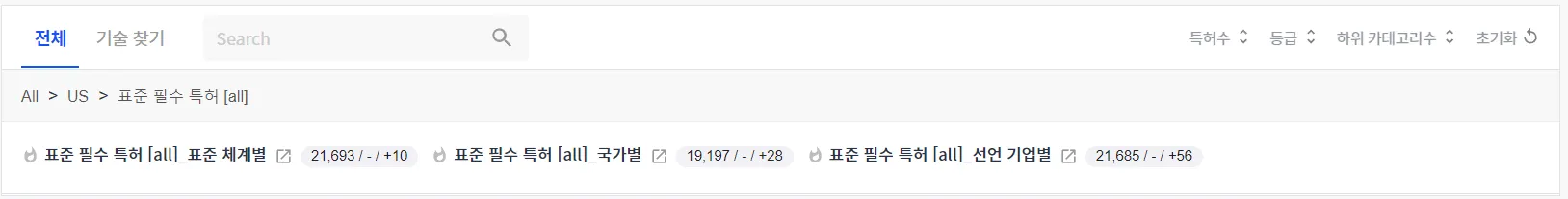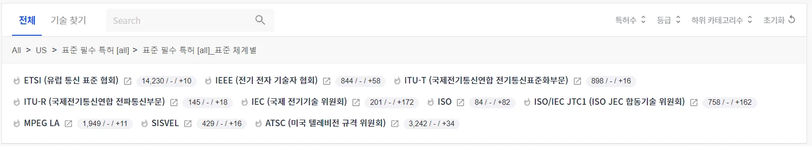 표준 필수 특허 [all] 카테고리(분류)를 탐색합니다. 표준 필수 특허 [all] 카테고리(분류)에는 i) 표준 체계별, ii) 국가별, iii) 선언 기업별과 같은 하위 분류가 있습니다.