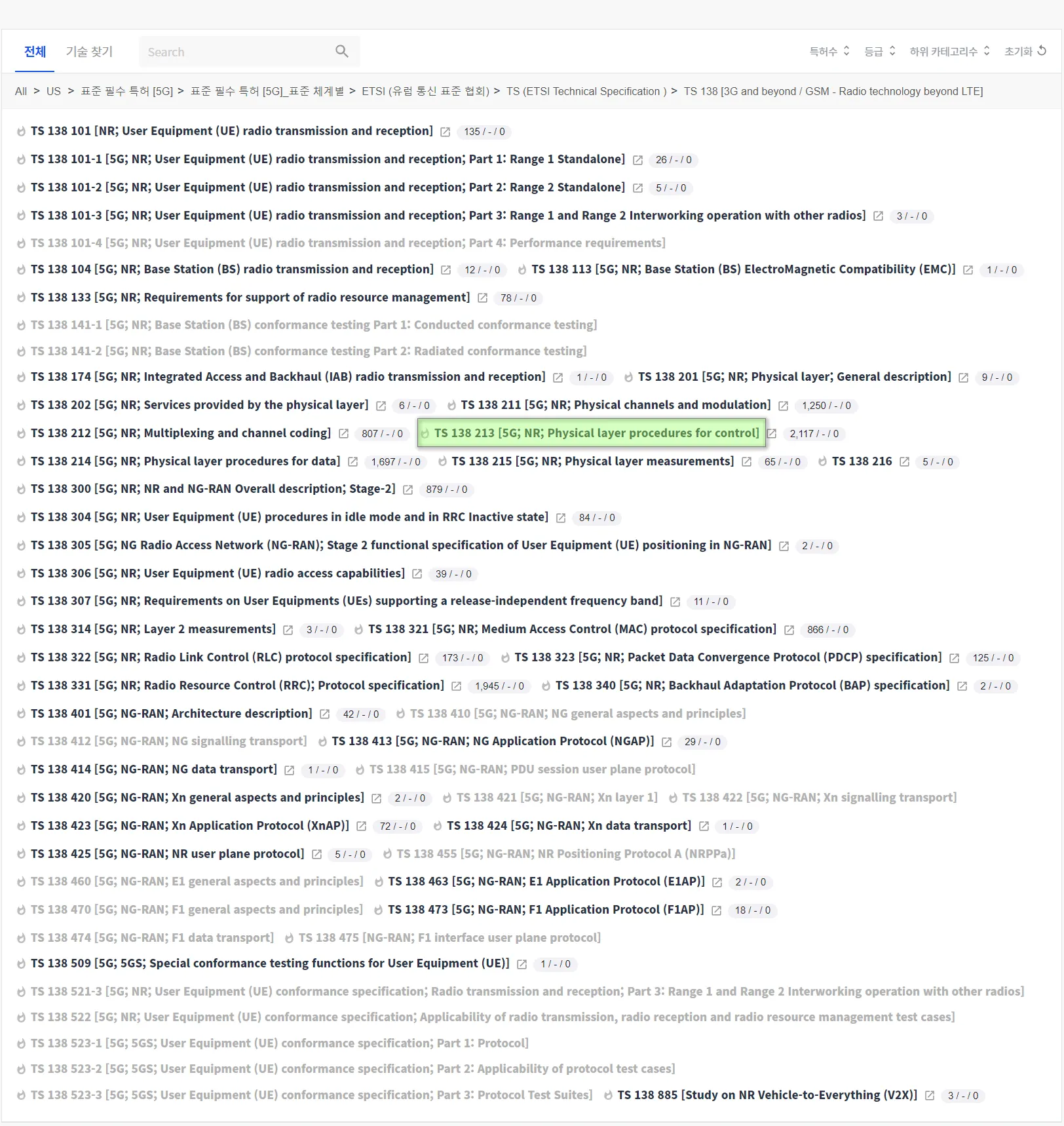 예시적으로 GoldenCompass 검색창에 “5G TS 138”을 입력합니다.