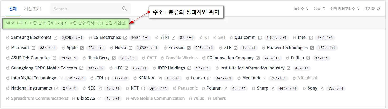아래 예시는 “표준 필수 특허 [5G]_선언 기업별”을 클릭했을 때 나타나는 하위 분류 체계입니다.