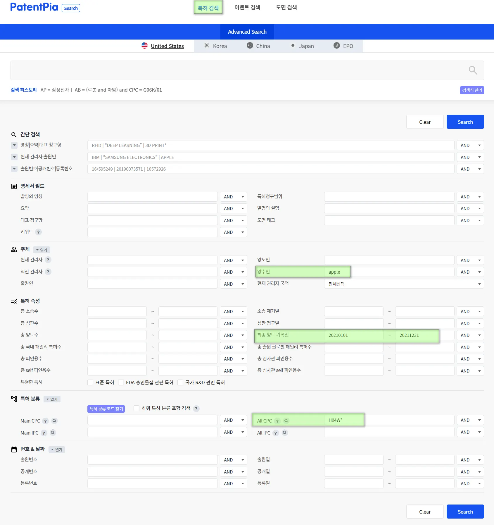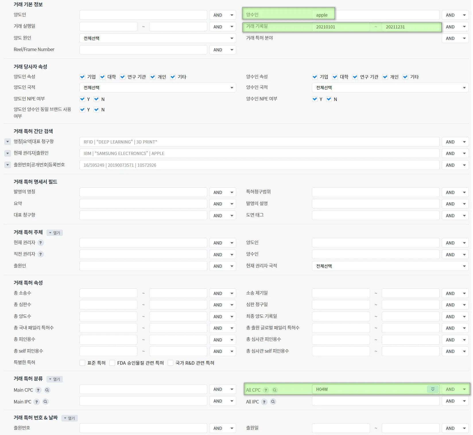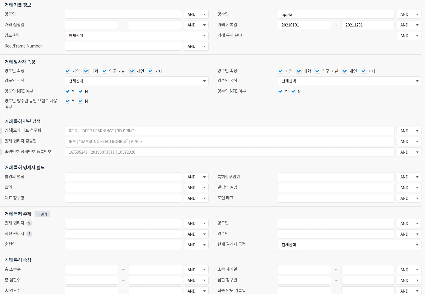 아래는 “거래 자체의 속성”으로 “Apple”이 2021년에 매입한 특허 거래를 검색하는 예시입니다. “양수인” 필드에 “Apple”을 입력하고, “거래 기록일” 필드에 “20210101~20211231”을 입력합니다.