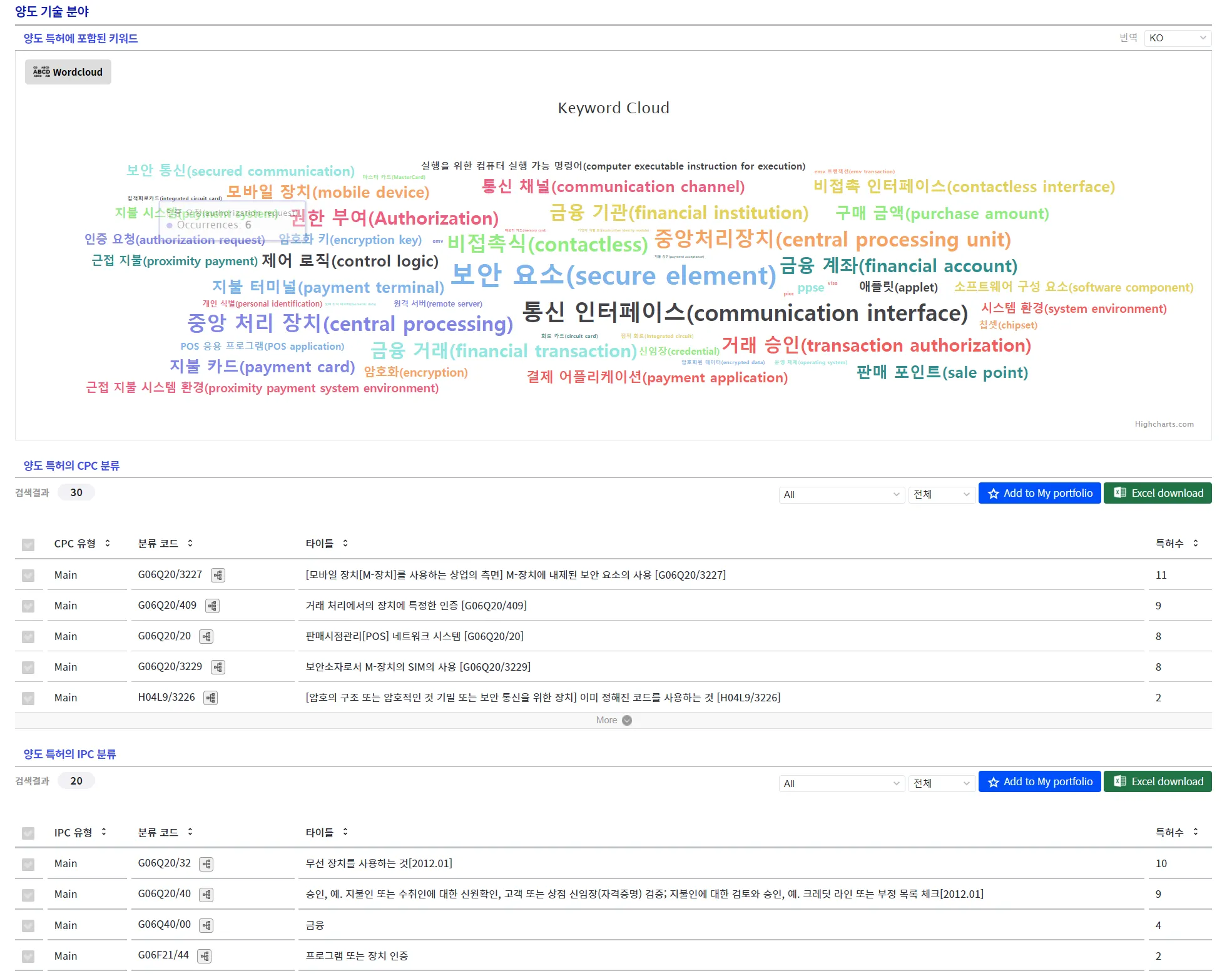 거래된 특허에서 추출한 키워드나 거래 특허의 CPC/IPC와 같은 분류 아이템 각각은 GoldenCompass의 개별 키워드홈 페이지나, 개별 CPC/IPC홈 페이지로 연결될 수 있습니다. 한편, 각 키워드/특허 분류(CPC/IPC) 등은 My 포트폴리오의 키워드 폴더나 특허 분류(CPC/IPC) 폴더 등록될 수도 있습니다.