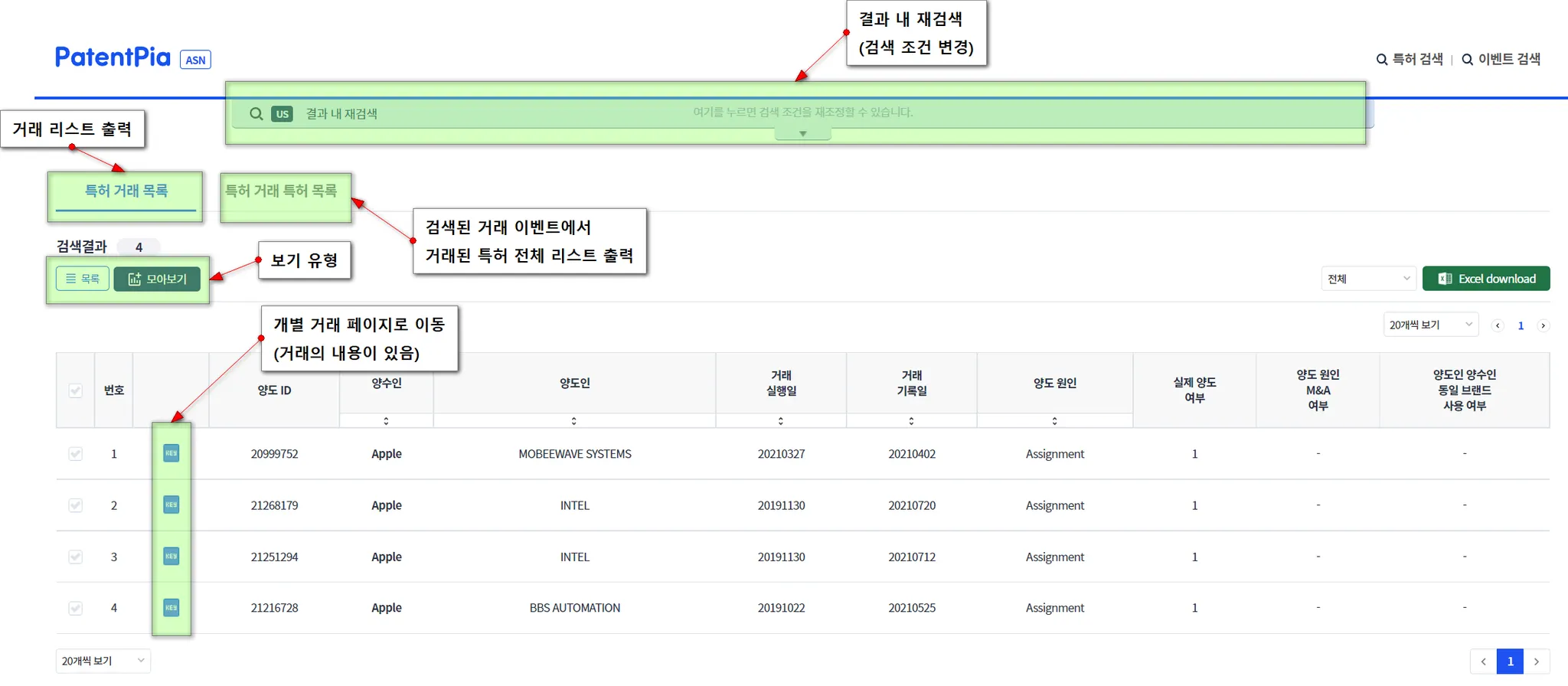 아래는 “목록” 모드로 제공되는 검색 결과 화면입니다. “목록” 모드에서는 “결과 내 검색”이 있어, 검색 조건을 변경할 수 있으며, 거래 리스트도 다운로드 받을 수 있습니다.
