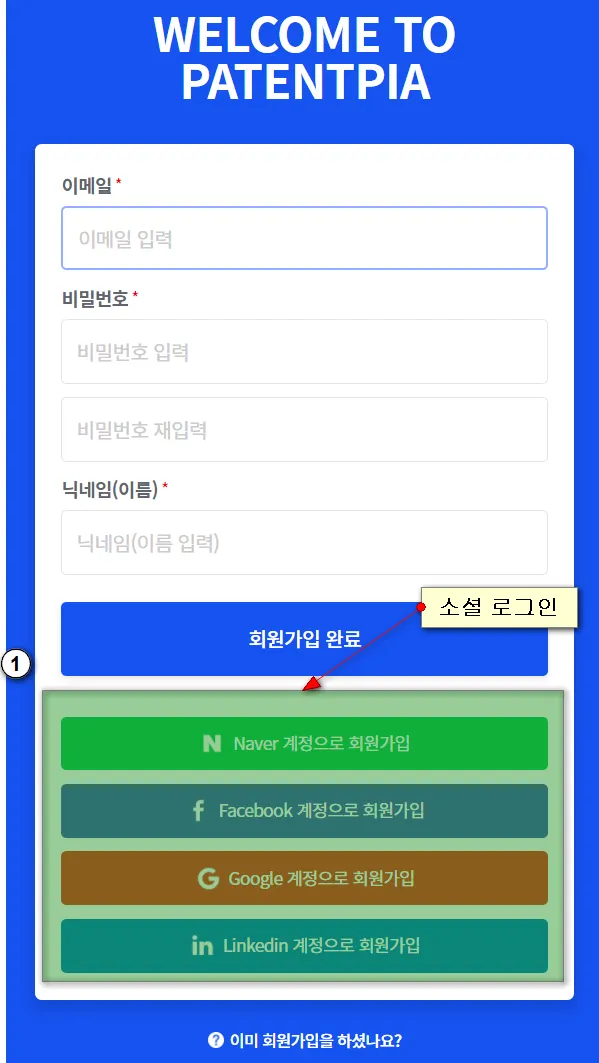 최초 회원 가입 시에 소셜 로그인을 한 경우에는 소셜 로그인을 사용해야 함.