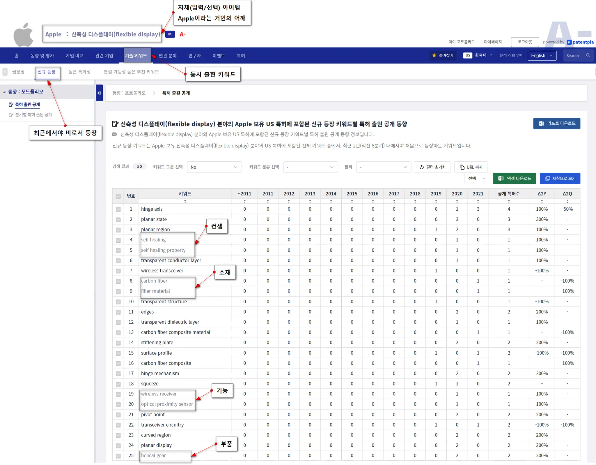 아래 예시에서 알 수 있듯이, "Apple"의 "flexible display" 특허에 함께 나타나는 동시 출현 키워드 들에는 i) 컨셉, ii) 기능, iii) 소재/물질, iv) 부품 등과 관련된 다양한 키워드들이 포함되어 있음을 알 수 있습니다.