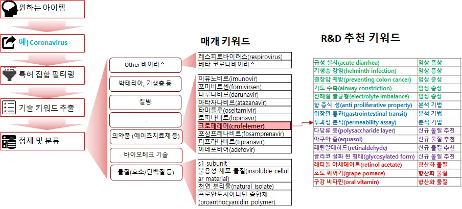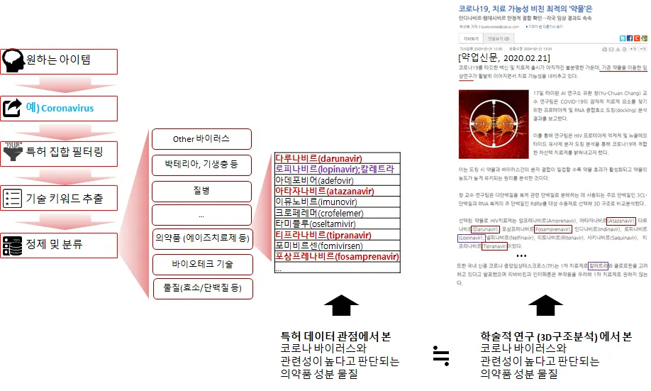 Coronavirus 라는 키워드와 같은 특허 문서에 함께 출현한 동시 출현 키워드(cooccurrent keyword)를 마이닝 해 본 결과, 신문 기사에서 나온 코로나 치료 후보 물질과 다수 일치하는 놀라운 결과가 발생한 바 있습니다. 이러한 예시는 기술 집단 지성인 글로벌 특허 빅데이터에서 혁신의 실마리를 찾을 수 있다는 암시이기도 합니다.