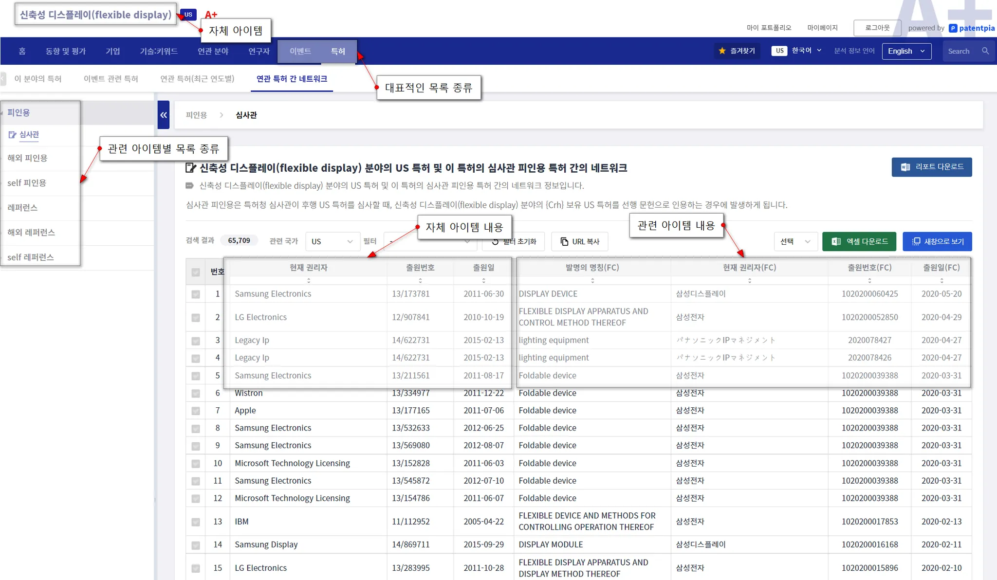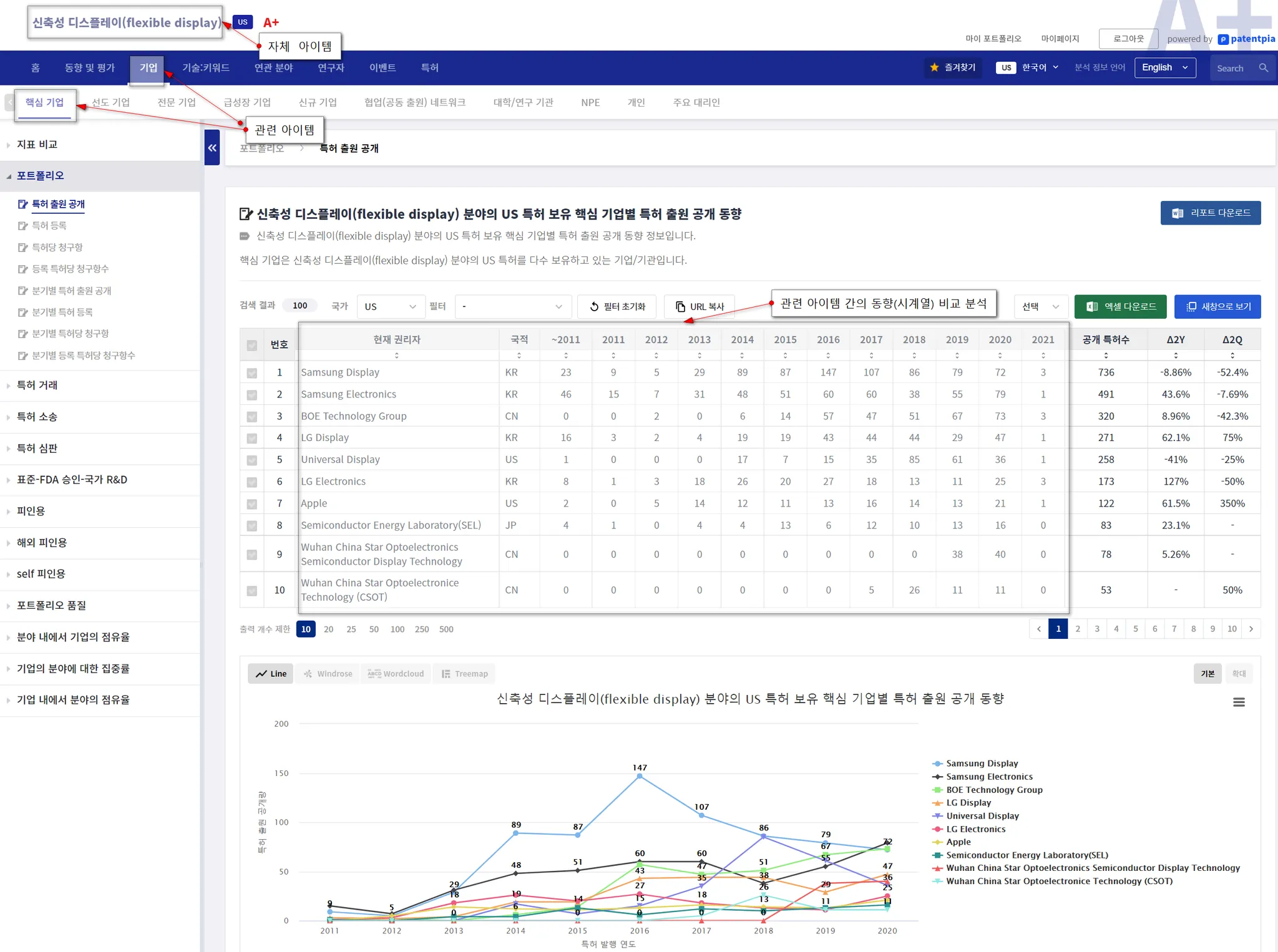 관련 아이템은 자체 아이템에 따라 다양할 수 있습니다. 예를 들면, 자체 아이템이 "flexible display"인 경우에는, "flexible display"와 관련된 특허를 보유하고 있는 i) 기업, ii)특허에 포함된 키워드, iii) 특허를 발명한 연구자, iv) 특허가 사용된 이벤트, v) 특허를 인용하는 후행 특허 등이 관련 아이템이 될 수 있습니다. 이런 다양한 관련 아이템의 동향(시계열) 분석이 제공됩니다.