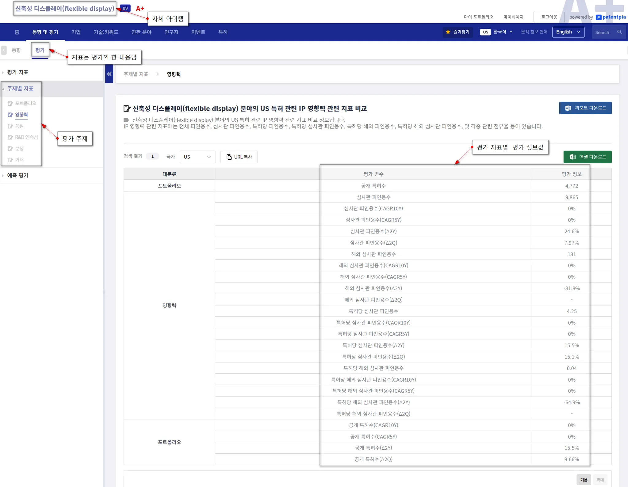 자체 아이템별 평가 지표는 중요한 것만 모아 놓은 i) 중요 지표, 각종 주제별로 지표를 모아 높은 ii) 주제별 지표, 미래 유망성/성장성/부상성 예측 AI 모델에 사용하는 iii) 예측 평가용 지표 등이 있습니다.
