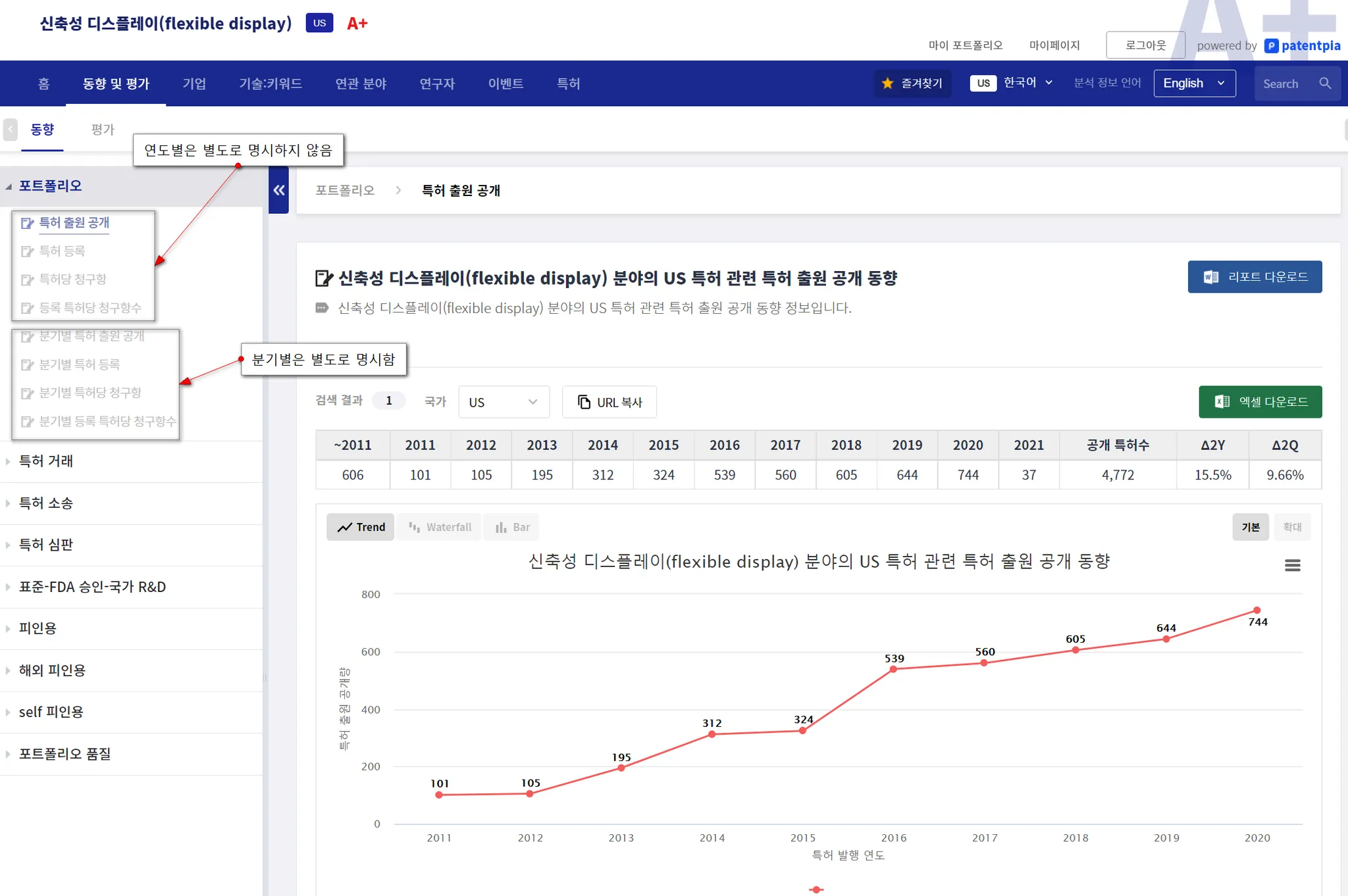 GoldenCompass는 1개의 기업(예, Apple), 기술, 연구자, 키워드(예, flexible display) 등과 같은 i) 단일 아이템 또는 단일 아이템이 2개 이상 결합된(예, Apple(기업)의 flexible display(키워드)) ii) 복합 아이템을 대상으로 한 분석 주제별 시간적 변화 추이에 대한 분석/시각화 콘텐츠를 제공합니다.