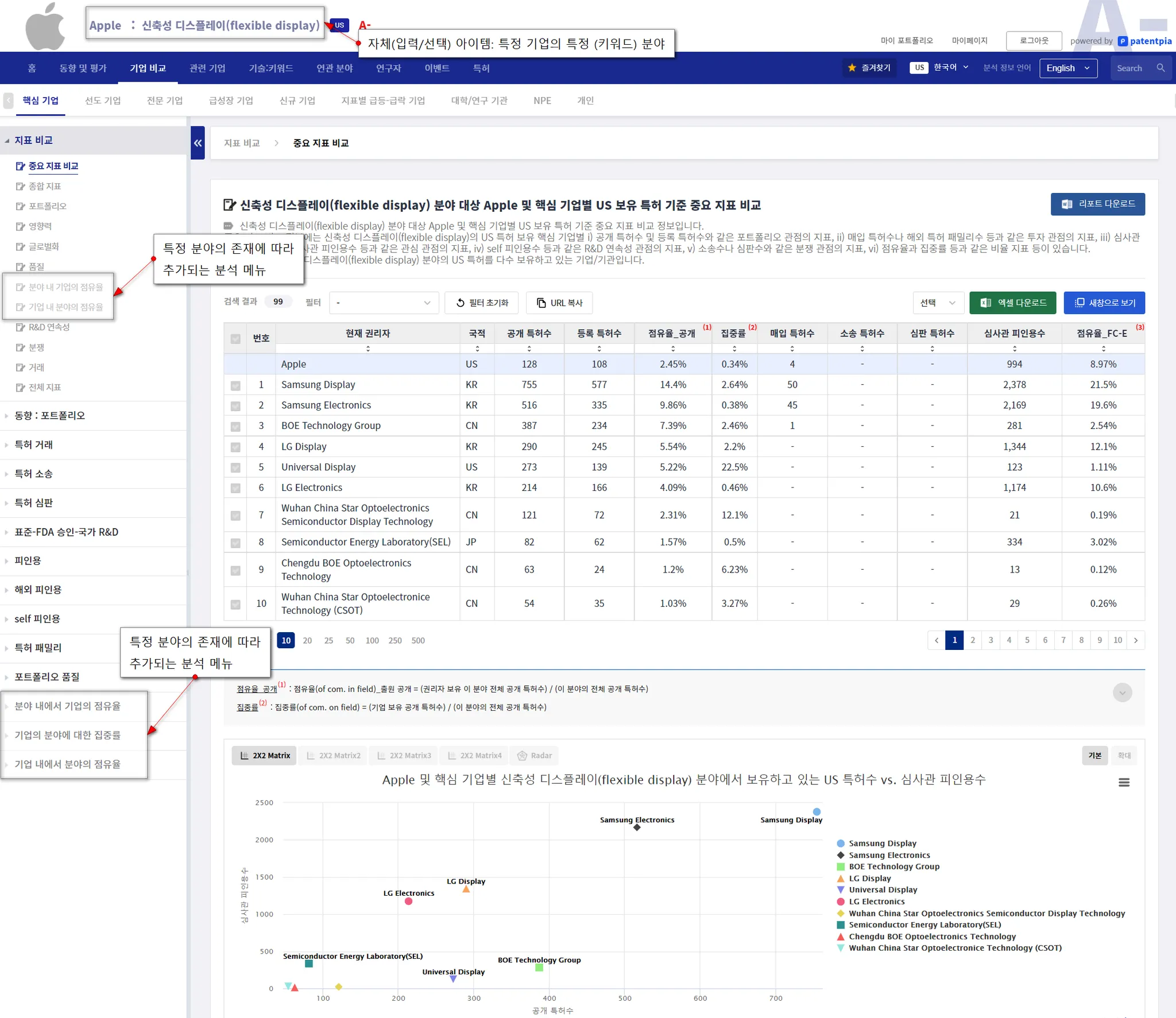 복수 개 기업군에 속하는 기업 간의 비교 분석 콘텐츠에는 i) 지표, ii) 특허 포트폴리오, iii) 영향력, iv) 충실성, v) 특허 품질, vi) 이벤트 등이 있습니다.