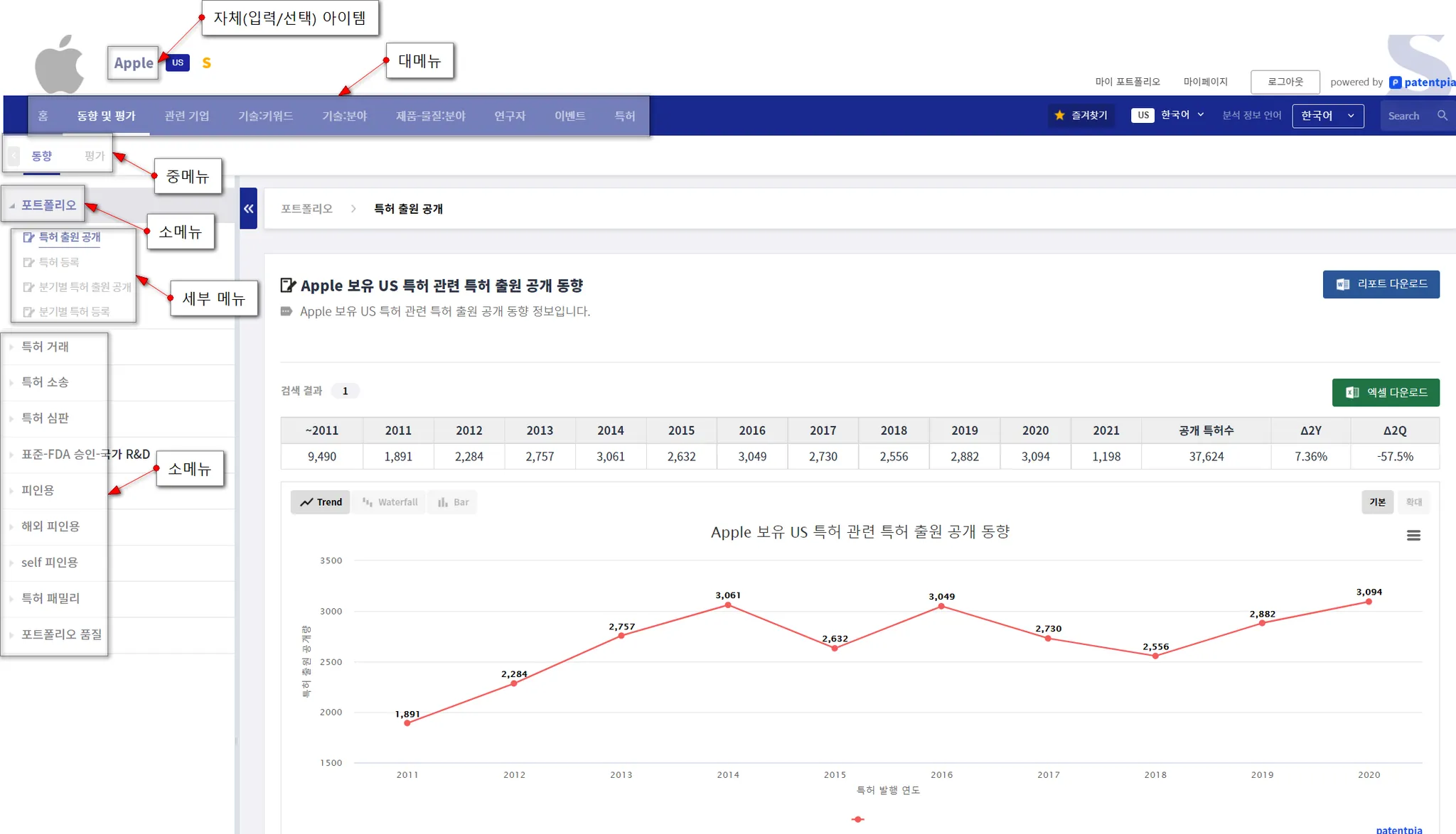 Apple을 관심 기업의 예시로 선정하여 PatentPia GoldenCompass를 활용한 경쟁사/기업 해부 콘텐츠를 제공합니다. 위 활용 지도의 각 항목에 결합되어 있는 사슬(링크) 표시를 클릭하면, 예시 화면이 새 창으로 열립니다.