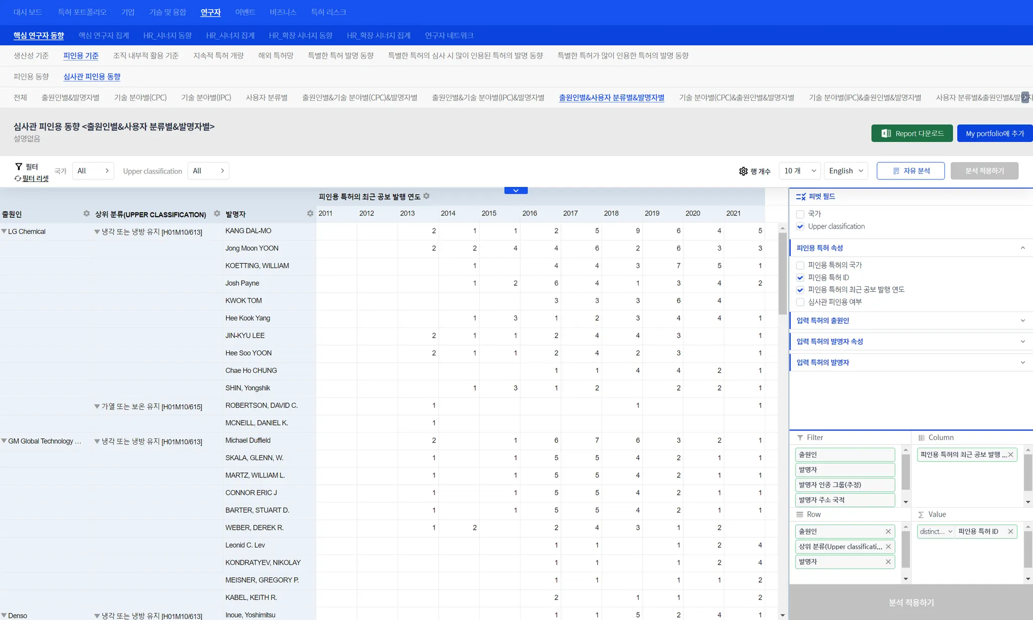 연구자별 테크 트리/사용자별 심사관 피인용 동향 분석은 분야의 핵심 연구자를 발굴할 때 가장 활발하게 사용되는 특허 분석입니다.